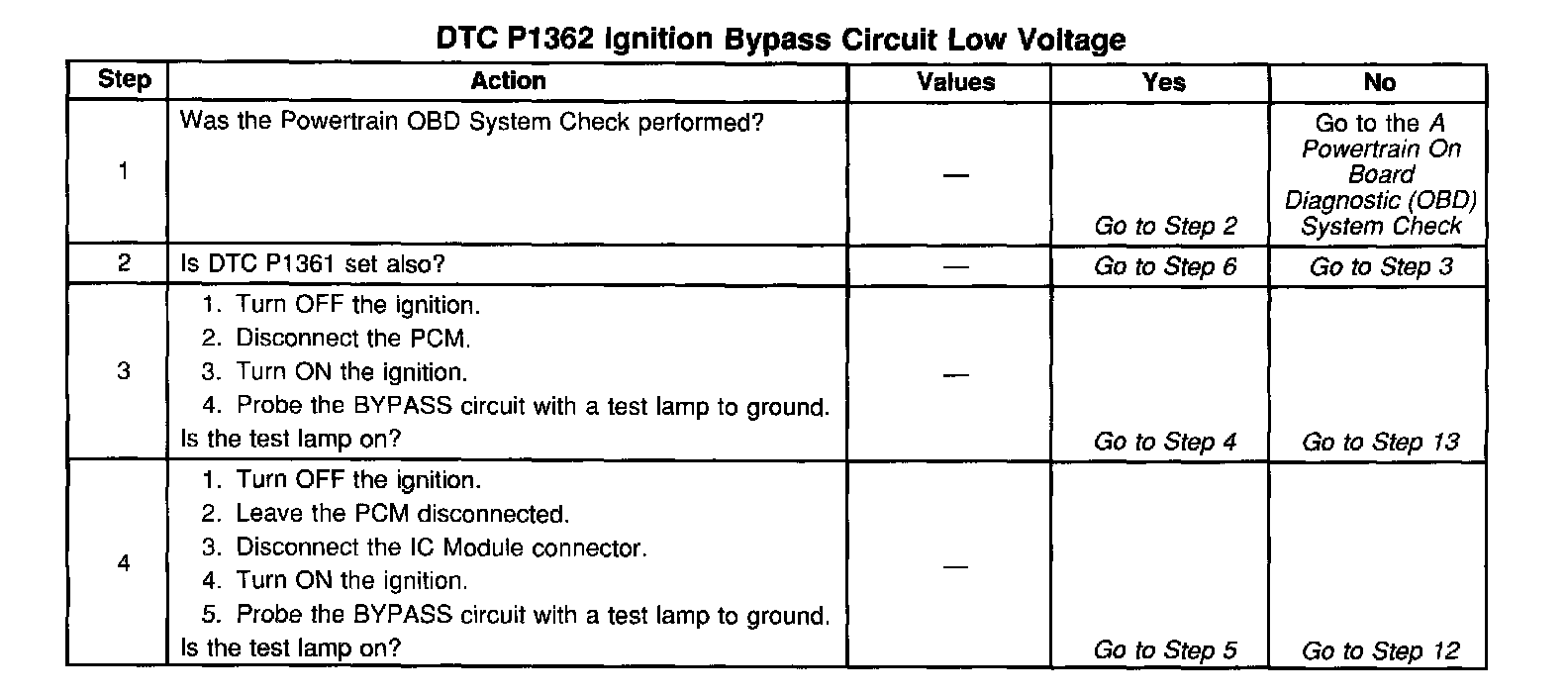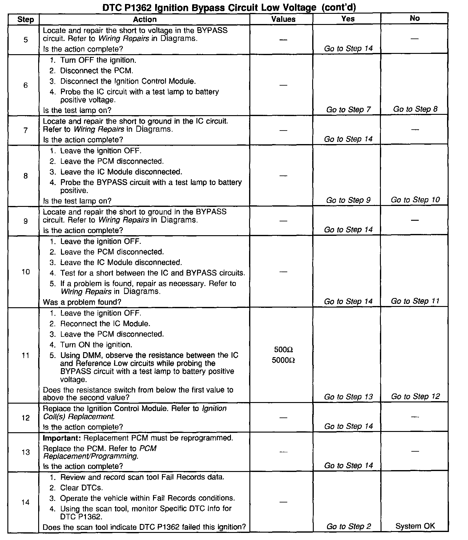 The Ignition Control (IC) Module sends signals that the PCM requires for fuel control and spark advance calculations. At the start of engine crank, the IC Module controls spark advance. When the second 3X reference pulse is recognized by the PCM, the PCM applies 5.0 volts to the Bypass circuit, commanding the IC Module to switch spark advance to PCM control. If the PCM detects a short to voltage in the Bypass circuit, DTC P1362 will set. A short to ground in the IC circuit or Bypass circuit will cause both DTC P1362 and DTC P1362 to set. The engine will start and may run with IC Module controlling spark timing.