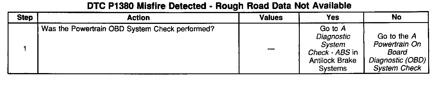 DTC P1380 set indicates that the ABS system has detected a malfunction which will not allow the EBCM/EBTCM to transmit correct rough road data to the PCM. The A Diagnostic System Check - ABS should be used to diagnose this condition.