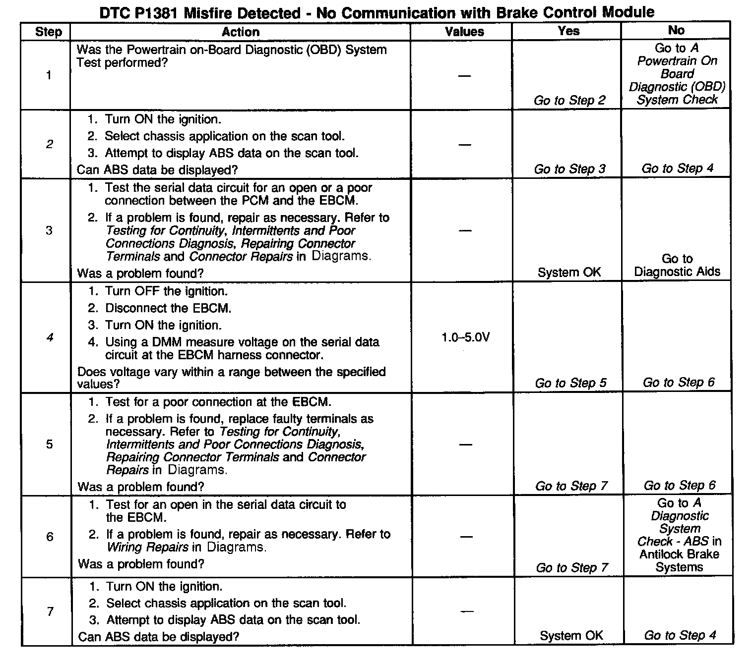 The PCM receives rough road information from the EBCM / EBTCM on the Class II serial data circuit. The PCM uses the rough road information to enhance the misfire diagnostic by distinguishing crankshaft speed variations caused by driving on rough road surfaces from variations caused by true misfires. The EBCM / EBTCM transmits rough road information based on inputs from the wheel speed sensors. If a loss of communication occurs which causes the PCM not to receive rough road information while DTC P0300 is requesting the MIL, DTC P1381 will set.