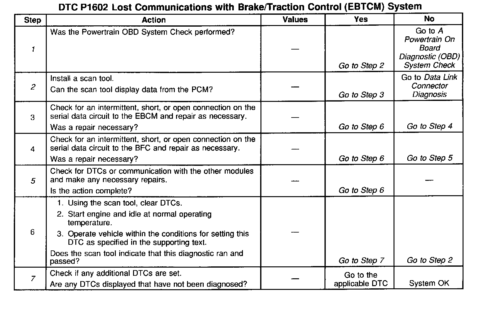 The numbers below refer to the step numbers on the diagnostic table: