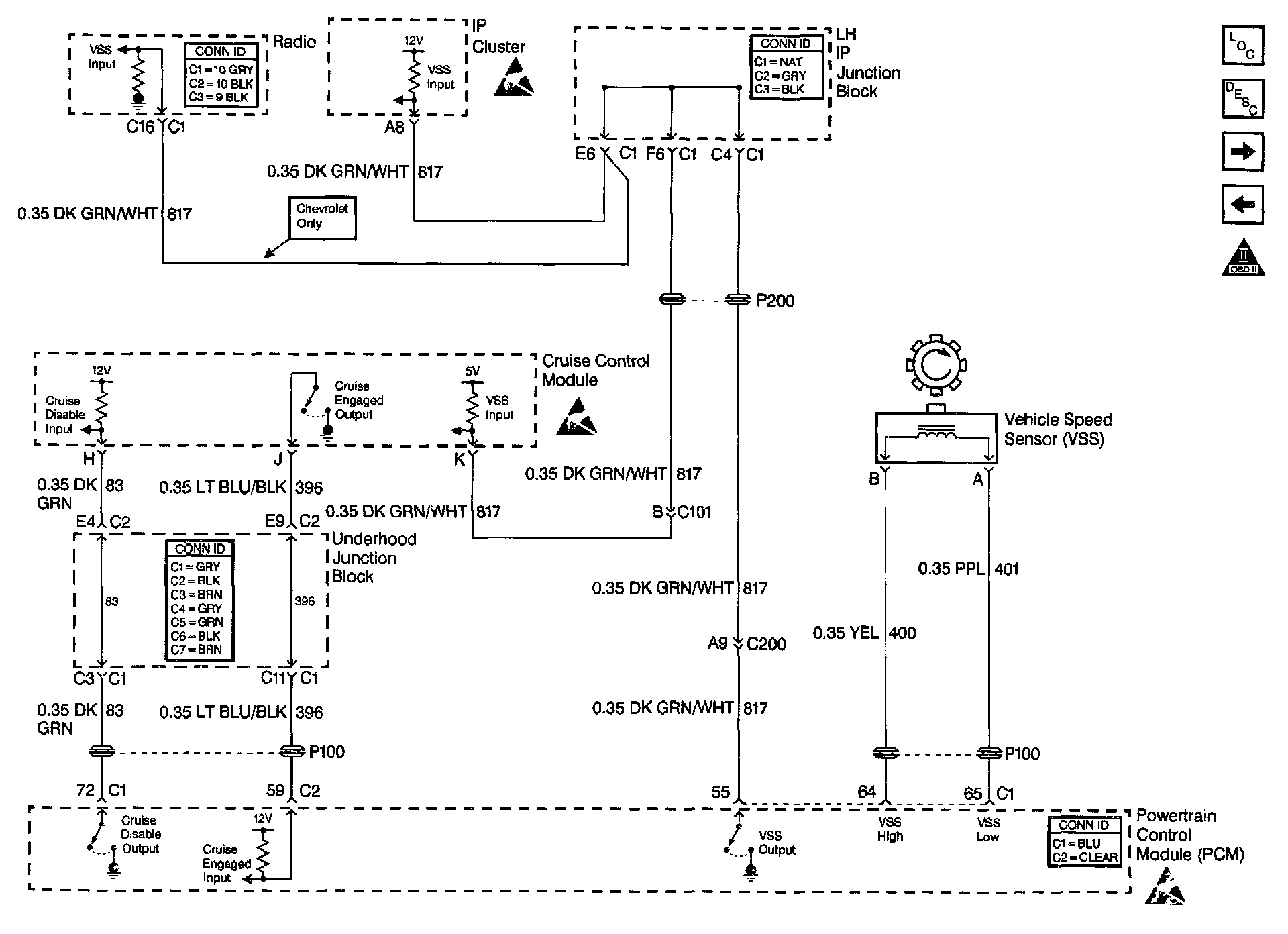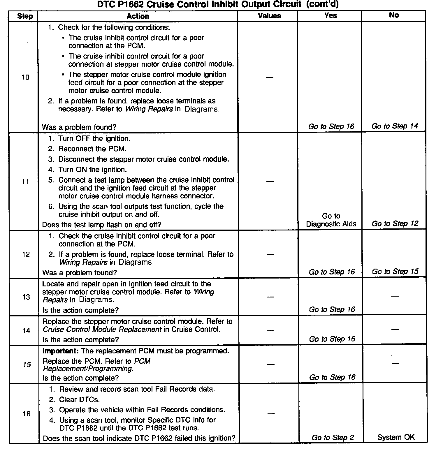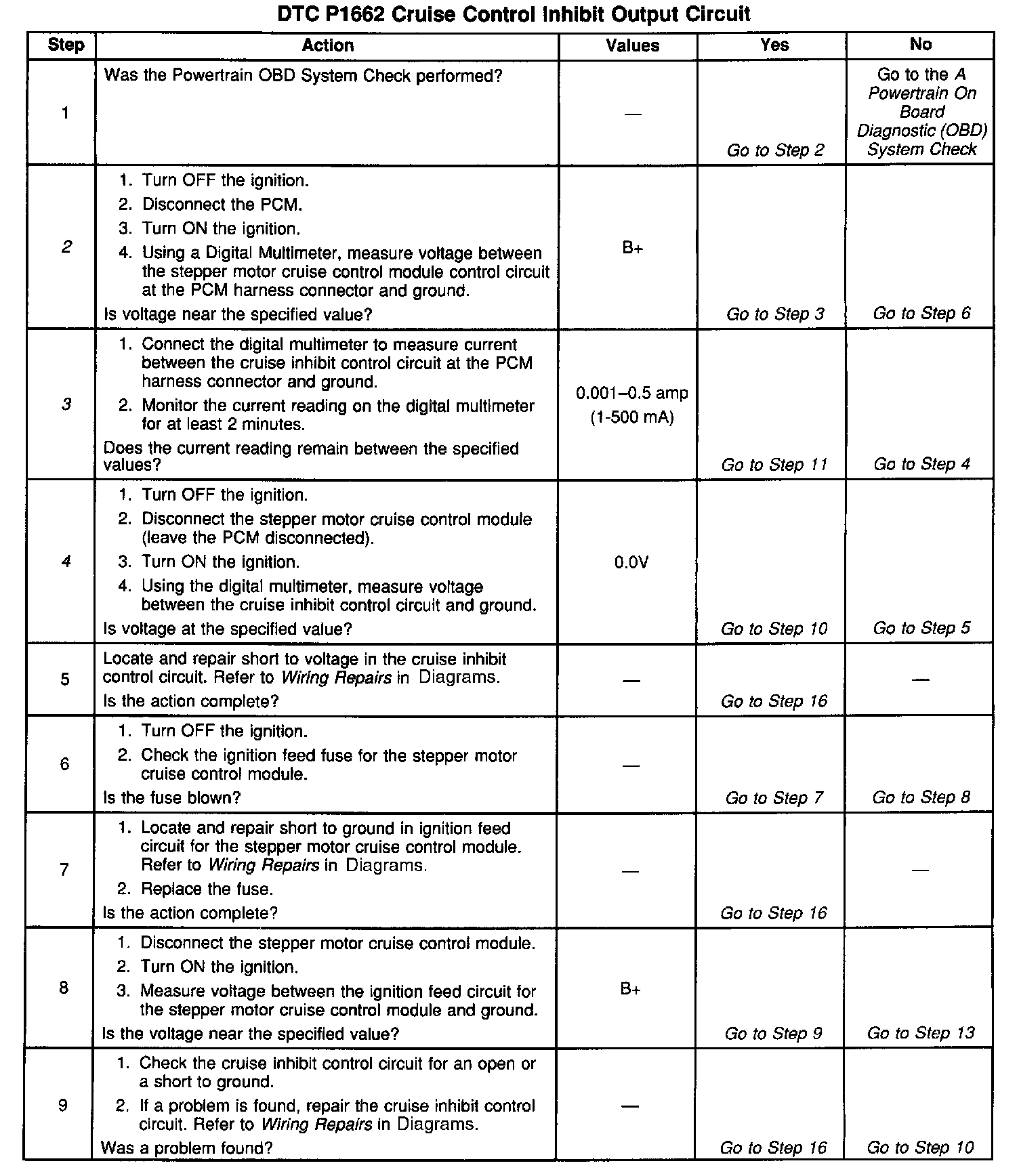Output Driver Modules (ODMs) are used by the PCM to turn on many of the current-driven devices that are needed to control various engine and Transaxle functions. Each ODM is capable of controlling up to 7 separate outputs by applying ground to the device which the PCM is commanding ON. DTC P1662 set indicates an improper voltage level has been detected on the output circuit which controls the stepper motor cruise control inhibit circuit.