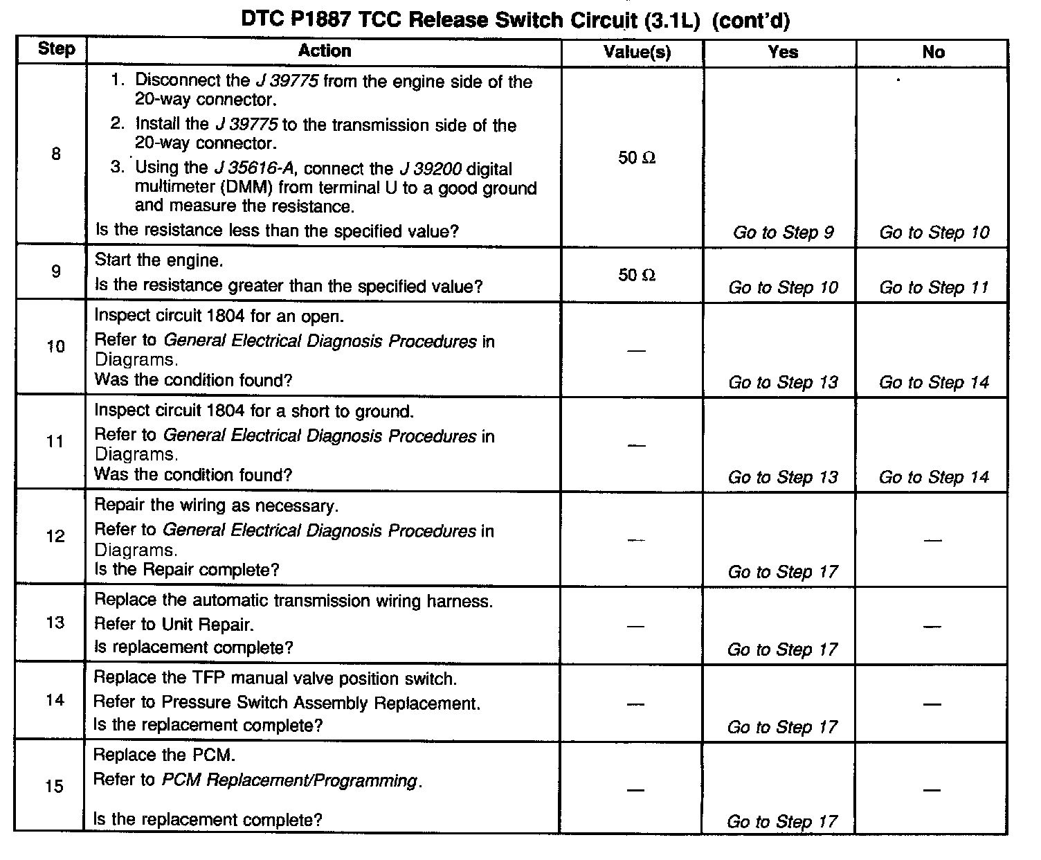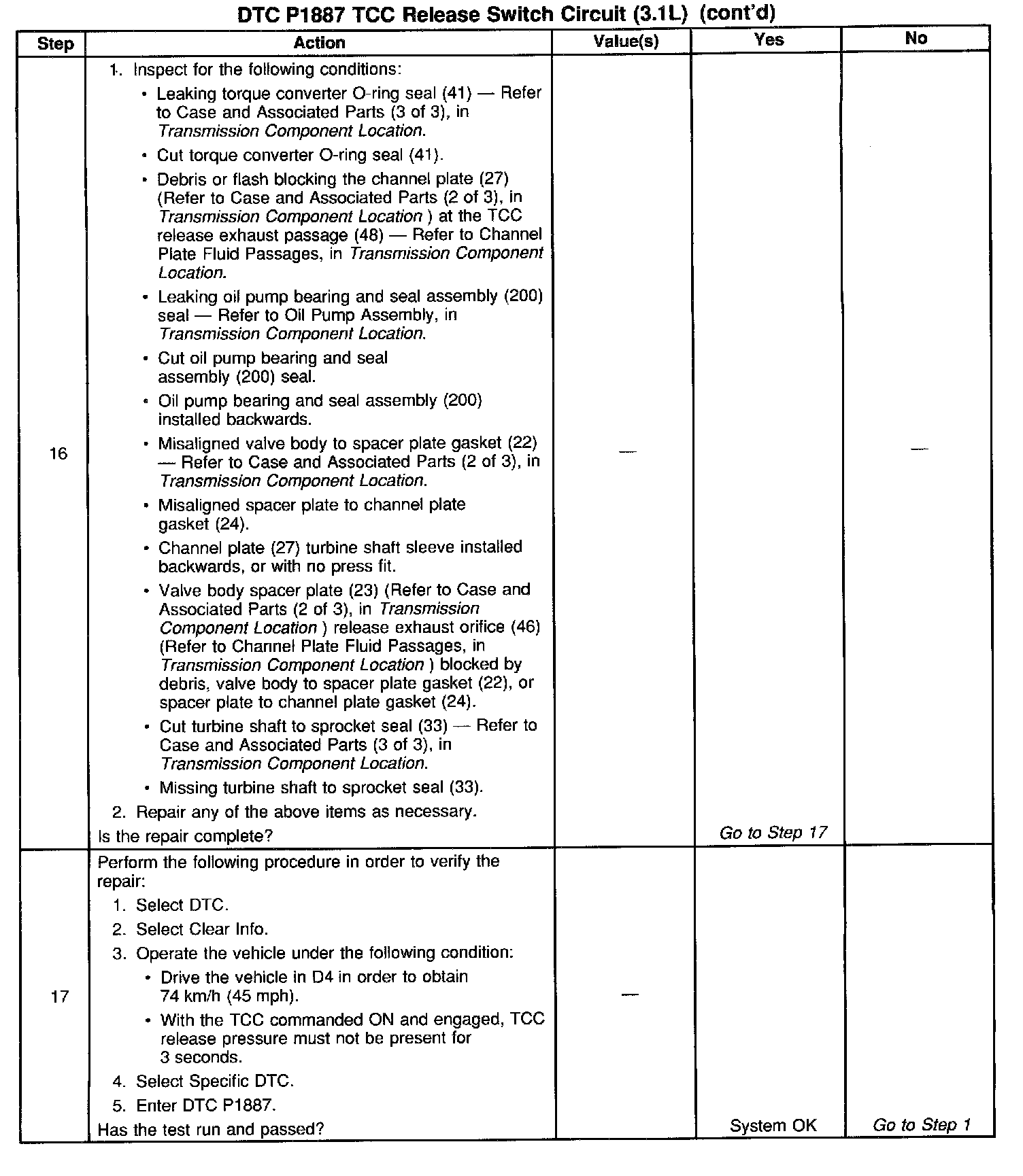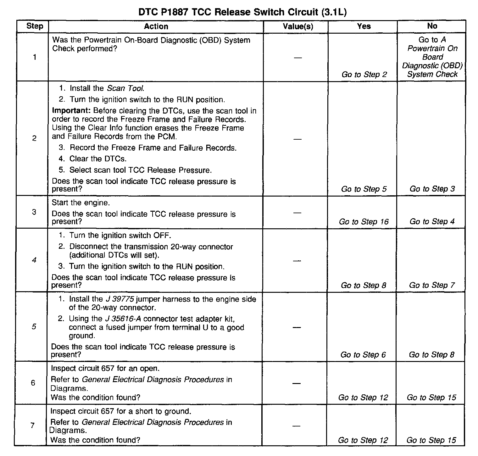 When the PCM determines that the TCC release switch is open (indicating that the TCC is not applied) and the TCC slip speed indicates that the TCC is applied, then DTC P1887 sets. DTC P1887 is a type B DTC.