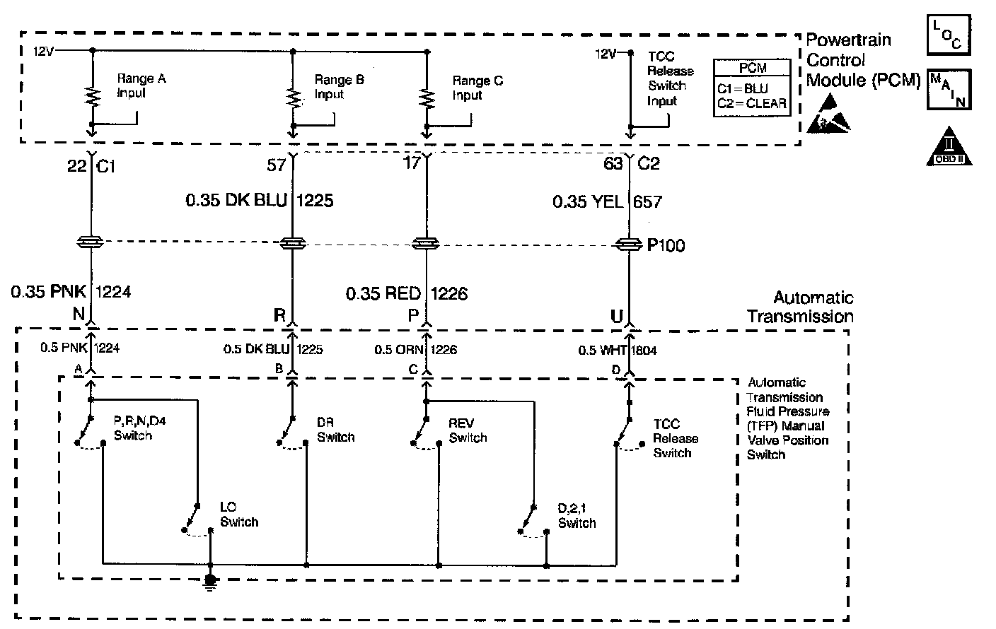 The Torque Converter Clutch (TCC) release switch is part of the automatic Transmission Fluid Pressure (TFP) Manual Valve Position Switch. The TFP manual valve position switch is mounted to the transmission valve body. The TCC release switch is normally-closed.
