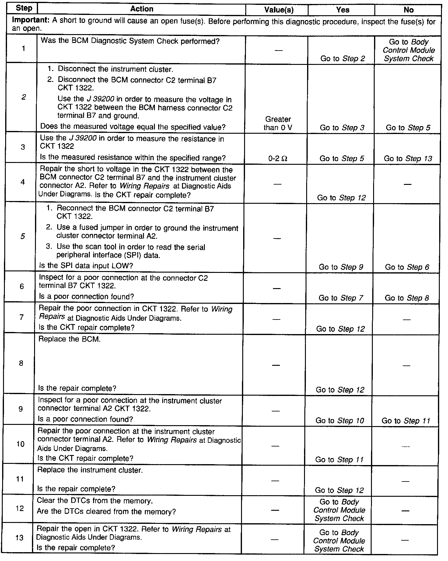 2. This step determines if there is a short to the battery in CKT 1322 between the body control module (BCM) and the instrument cluster.