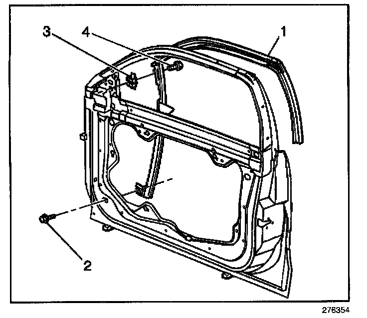1. Push on the front door window front run channel (1) in order to engage the retainer to the door frame.