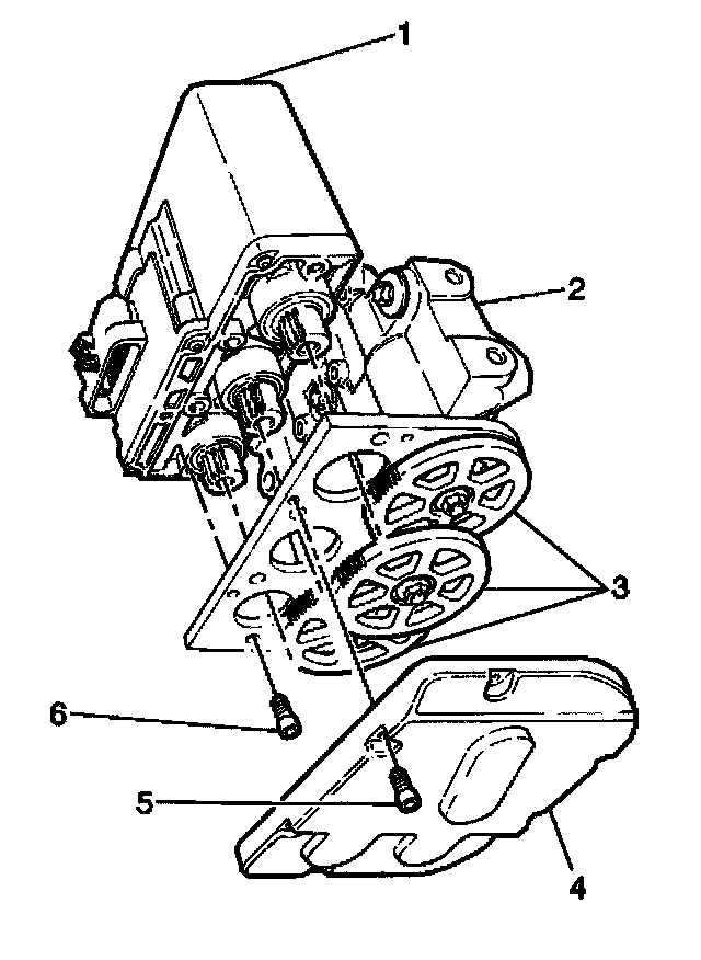 4. Remove the four Torx head screws (6) attaching the motor pack (1) to the brake modulator (2).