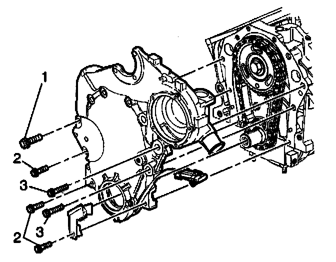 4. Install the engine front cover bolts (3).