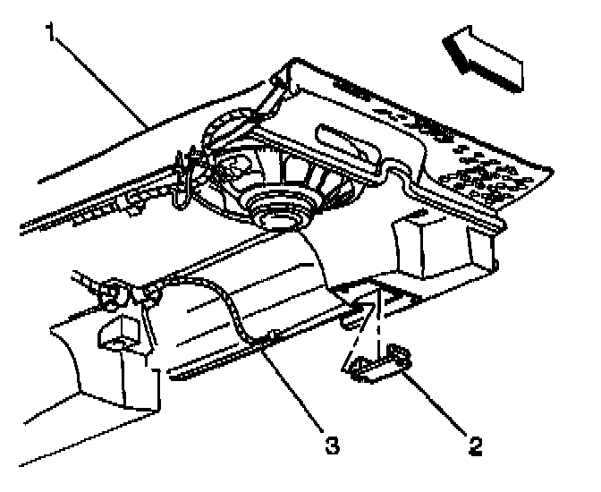 1. Release the tabs that retain the rear compartment lamp (2) to the rear shelf panel (1). Perform the procedure from inside the rear compartment.
