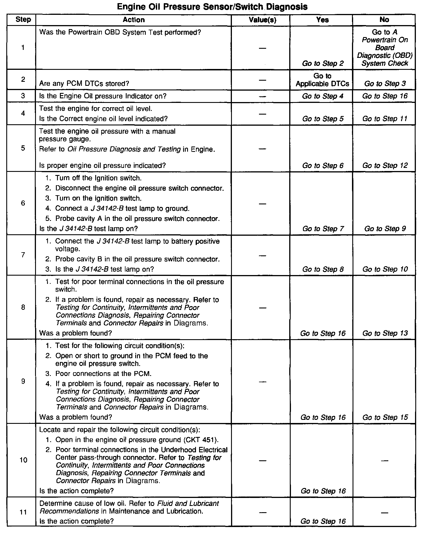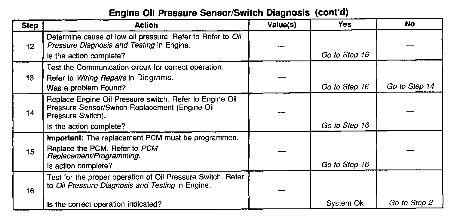 ^ Damaged harness. Inspect the wiring harness for damage. If the harness appears to be OK, disconnect the Engine Oil Pressure switch, turn the ignition on and observe a voltmeter connected between the Engine Oil Pressure switch connector terminals while moving wiring harnesses related to the Engine Oil Pressure Switch circuit. A change in voltage will indicate the location of the fault. Refer to Intermittents and Poor Connections Diagnosis. Symptom Related Diagnostic Procedures