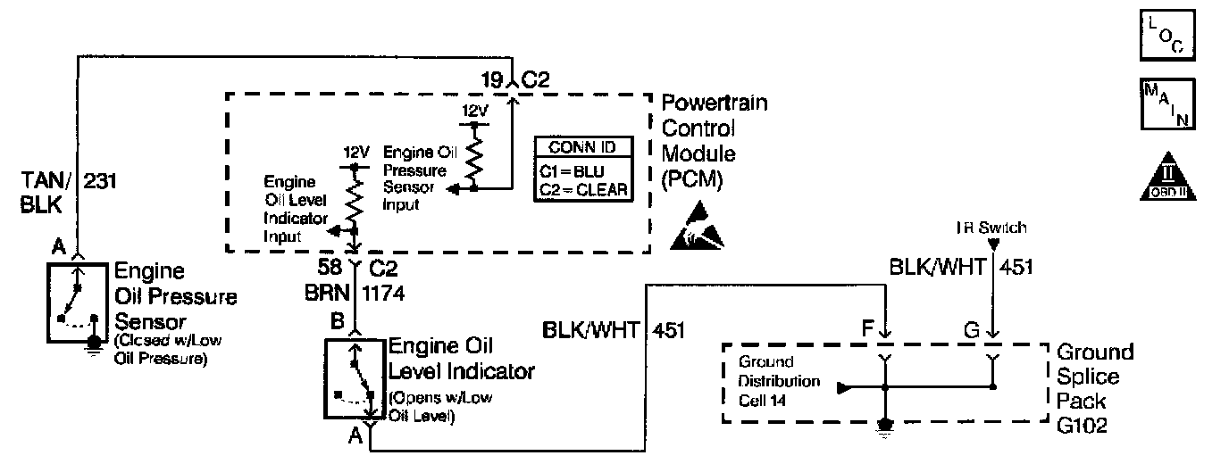 The PCM applies battery voltage through a pull up resistor to the Engine Oil Pressure Switch circuit. The PCM monitors the applied voltage on the Engine Oil Pressure Switch circuit. If the ignition switch is turned on with the engine not running or engine oil pressure is below 35 kPa (5 psi), the Engine Oil Pressure switch grounds the PCM voltage input. The PCM sends the engine oil pressure information via Class II serial data to the Instrument Panel Cluster (IPC). The IPC controls the Engine Oil Pressure Indicator.