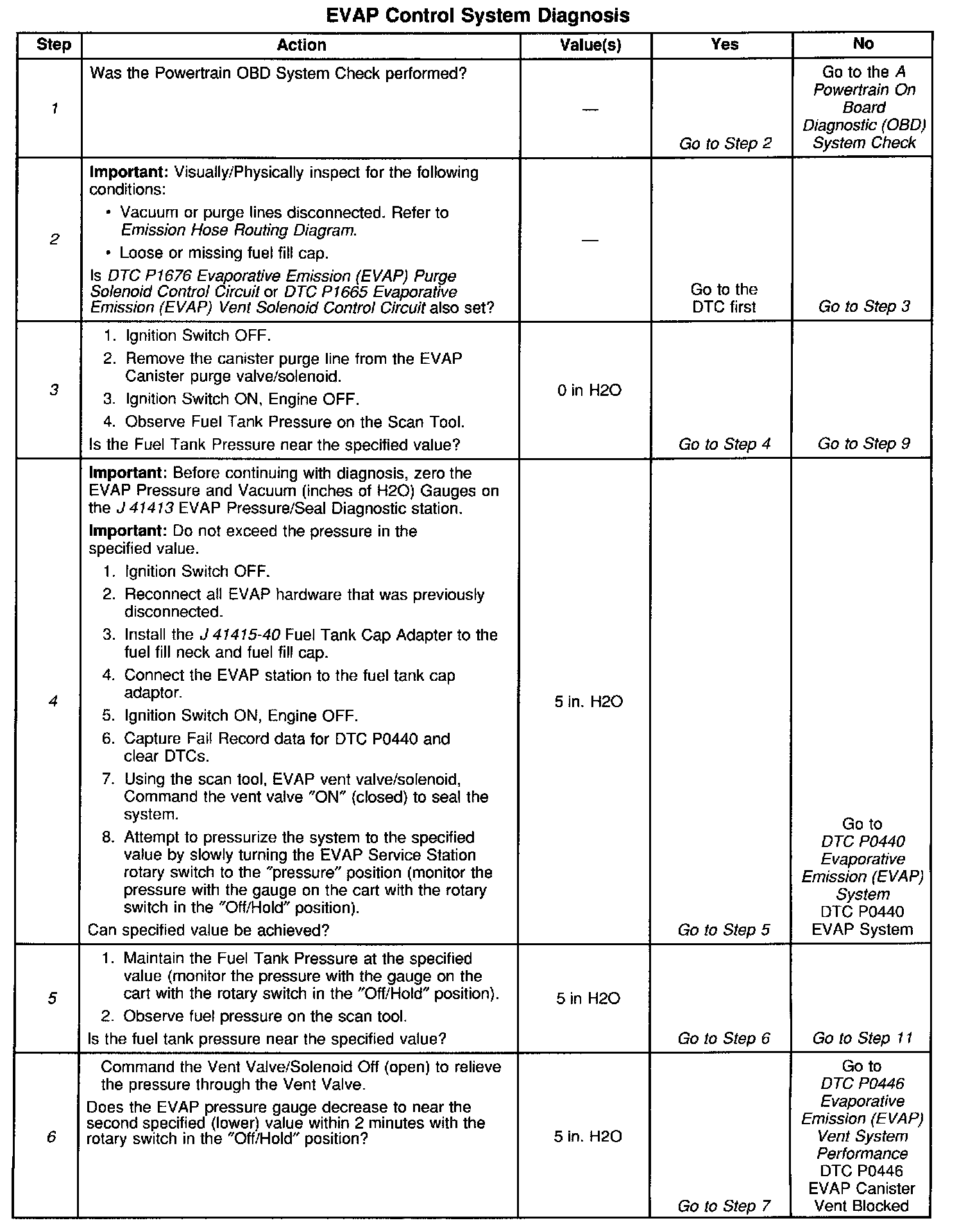 A stuck closed [1][2]EVAP purge valve/solenoid, Stuck open EVAP vent valve/solenoid, disconnected or damaged EVAP Purge line or vent hose, leaking fuel cap, or fill neck should set a DTC P0440. A small leak in the EVAP system should set a DTC P0442 An EVAP vent valve/solenoid stuck closed, a restricted vent hose, or a blocked EVAP canister should set a DTC P0446. A continuous purge condition with no purge commanded by the PCM (EVAP purge valve/solenoid stuck open or leaking) should set a DTC P1441. Refer to the DTC tables for further diagnostic procedures regarding the EVAP system. Testing and Inspection