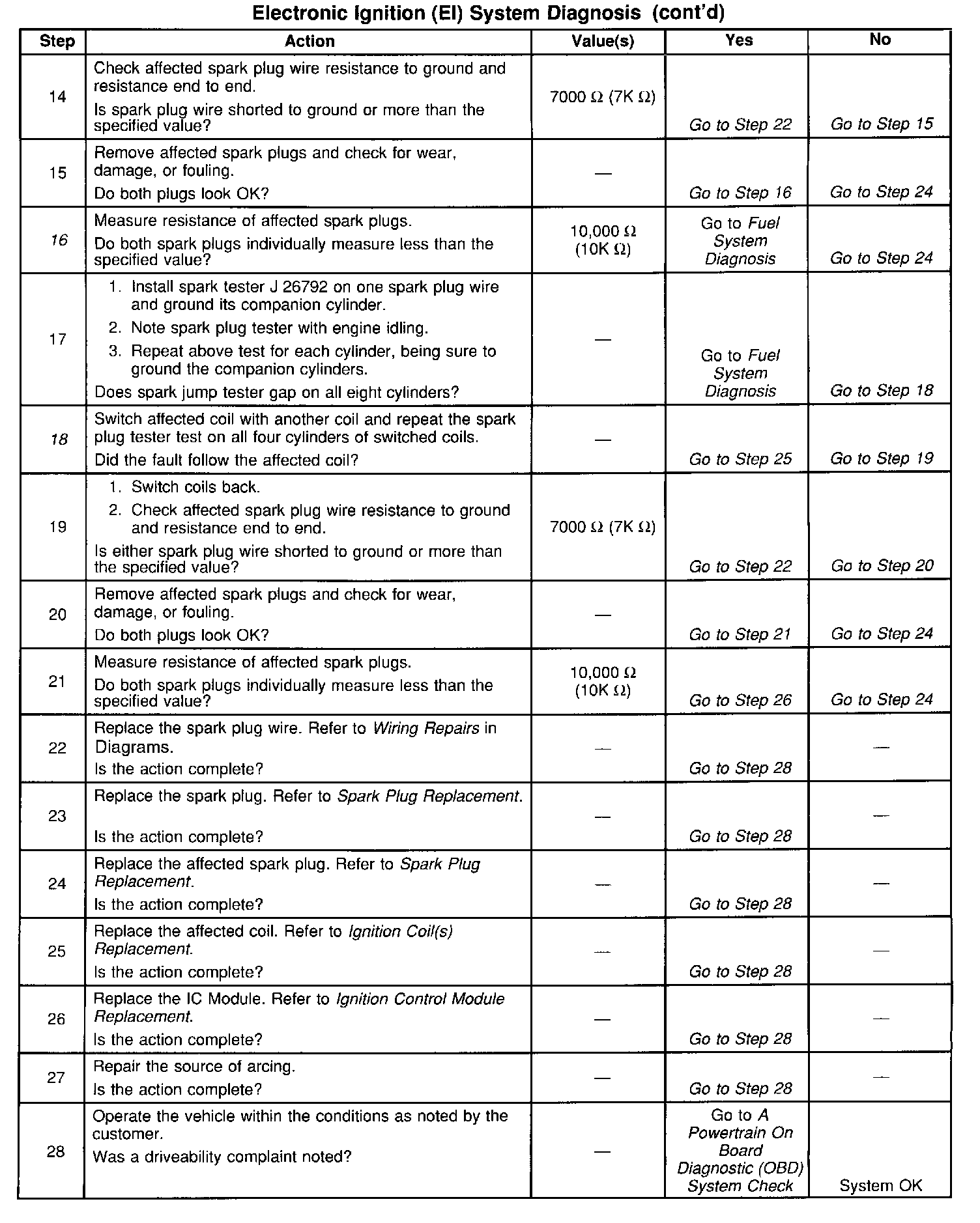16. Ensure good DMM contact when measuring spark plug resistance. When manufactured the normal resistance for the spark plug is 900-2500 ohms but resistance growth up to 10K ohms is considered normal. A suspected ignition system miss may actually be a fuel system problem. Perform the Fuel System Diagnosis, if it has not yet been performed.