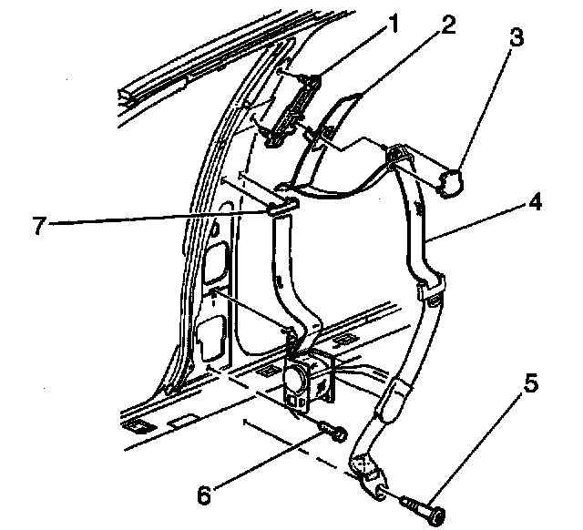 1. Remove the center pillar upper trim panel. Refer to Trim Panel Replacement - Upper Center Pillar in Interior Trim.