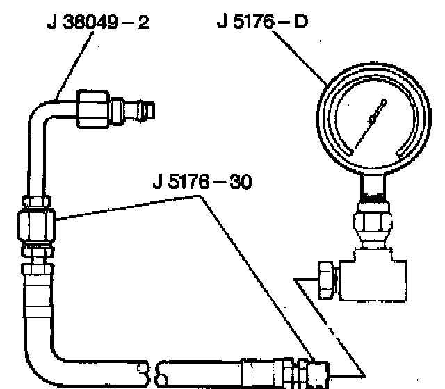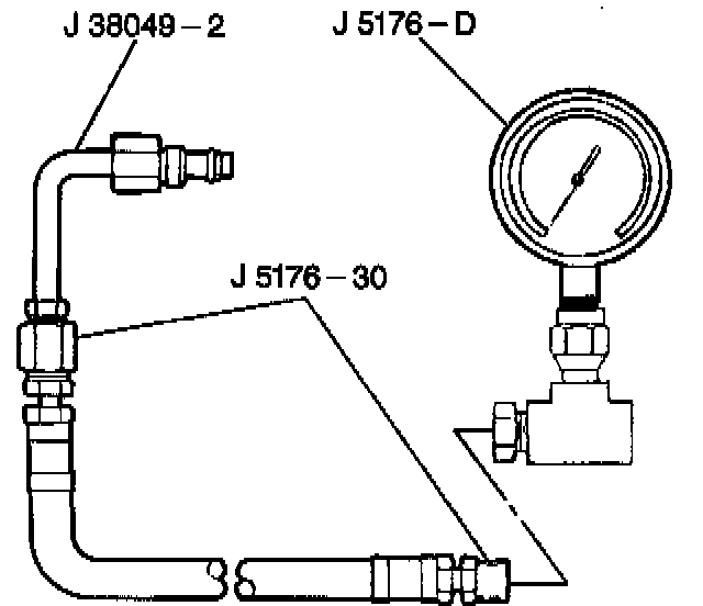 2. Connect the J 25323-A or J 5176-D to both of the hoses. The J 25323-A will measure the flow rate as well as the pressure.