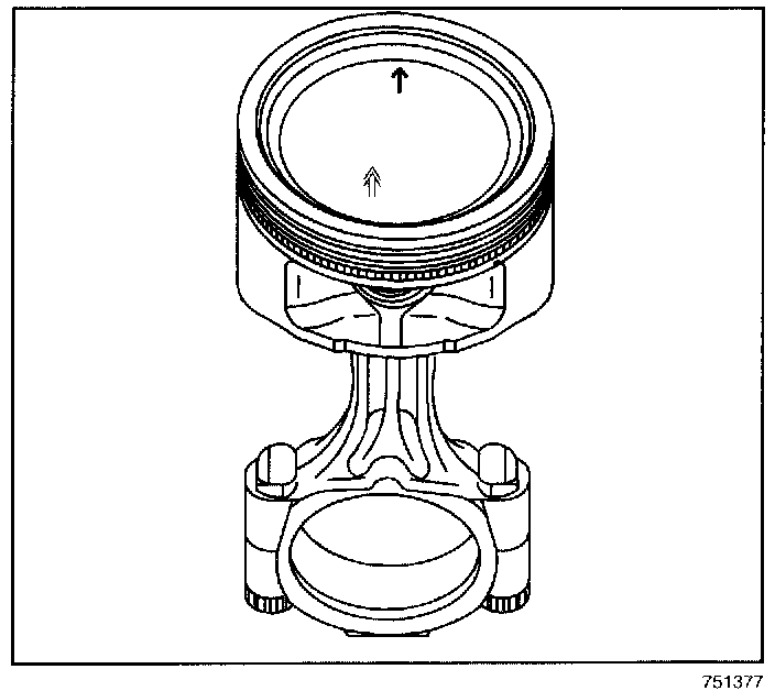 8. Refer to the above illustration. Install the assembled piston and rod assembly into the engine. Verify that the directional arrows on the top of the piston point to the front of the engine.