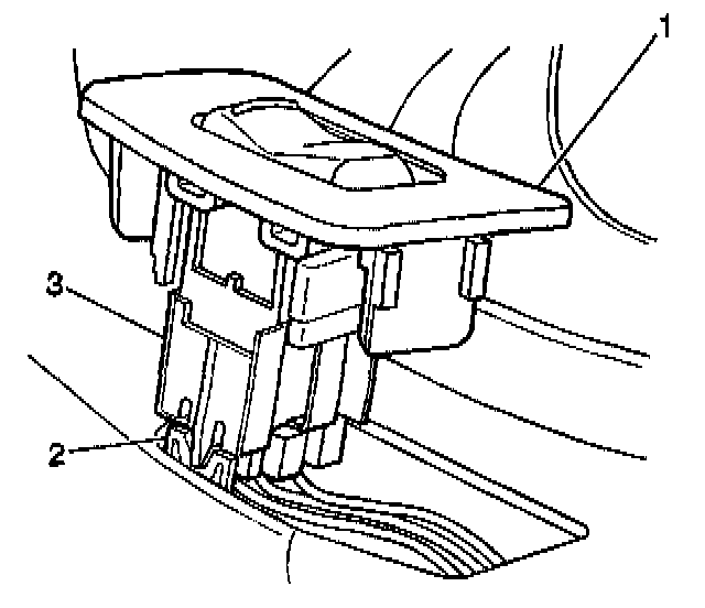 2. Remove the door power window switch (3) from the door by prying at the top of the switch with a flat bladed tool.