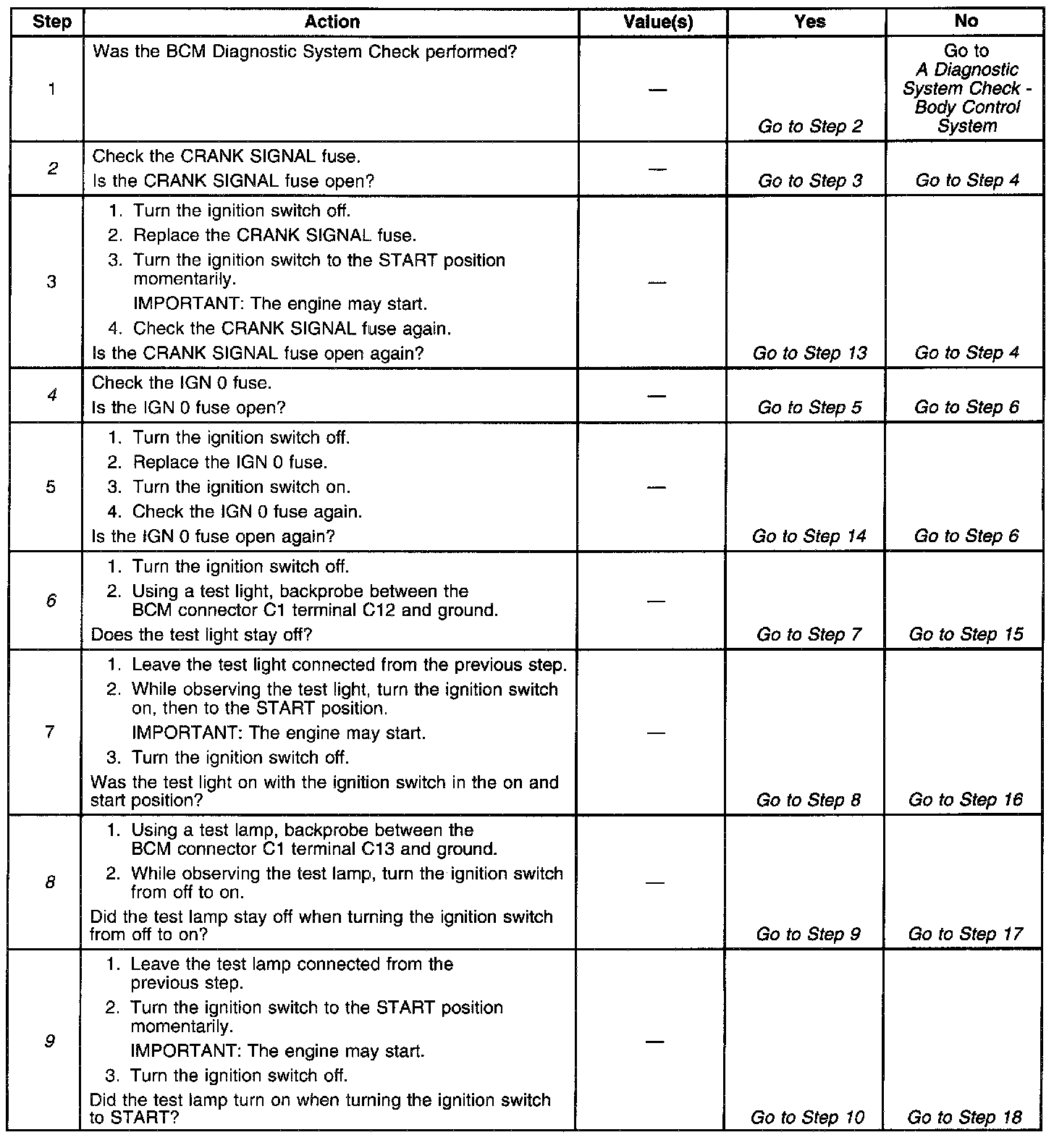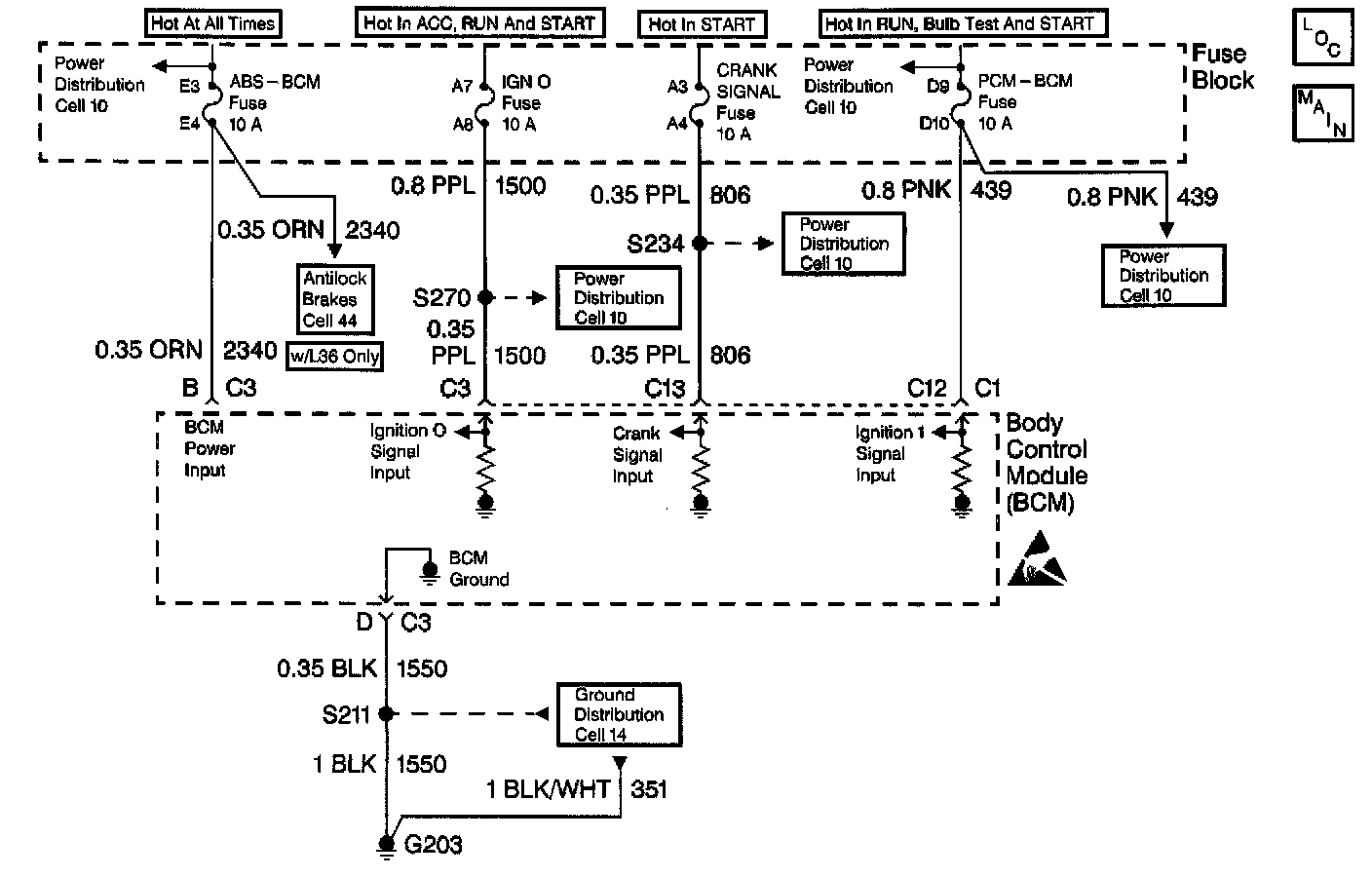The BCM receives three voltage inputs. The BCM receives voltage from the IGN 0 fuse through circuit 1500 at all times except when the ignition switch is off. The BCM receives voltage from the PCM-BCM fuse through circuit 439 when the ignition switch is in the on or start position. The BCM receives voltage from the CRANK SIGNAL fuse through circuit 806 when the ignition switch is in the start position.