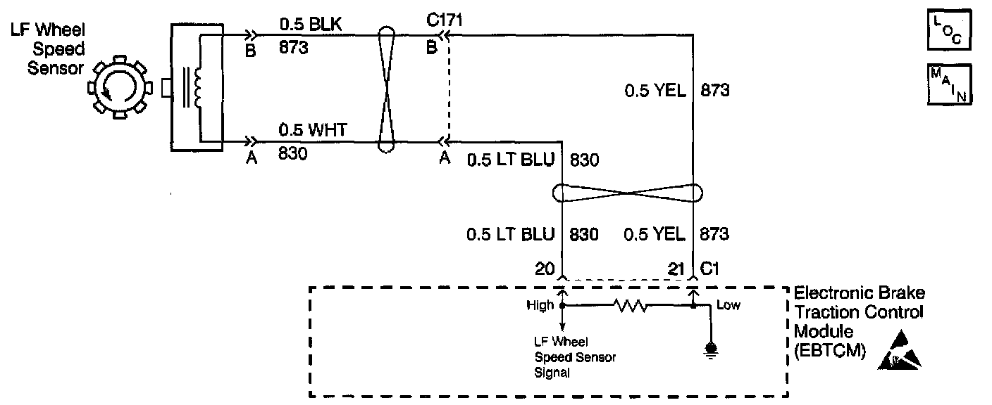 The speed sensor used on this vehicle is a multiple pole magnetic pickup. This sensor produces an AC signal that the EBTCM uses the frequency from to calculate the wheel speed.
