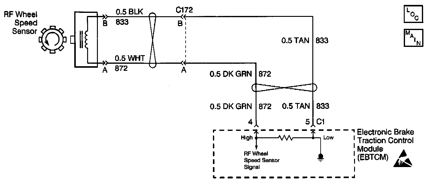 The speed sensor used on this vehicle is a multiple pole magnetic pickup. This sensor produces an AC signal that the EBTCM uses the frequency from to calculate the wheel speed.