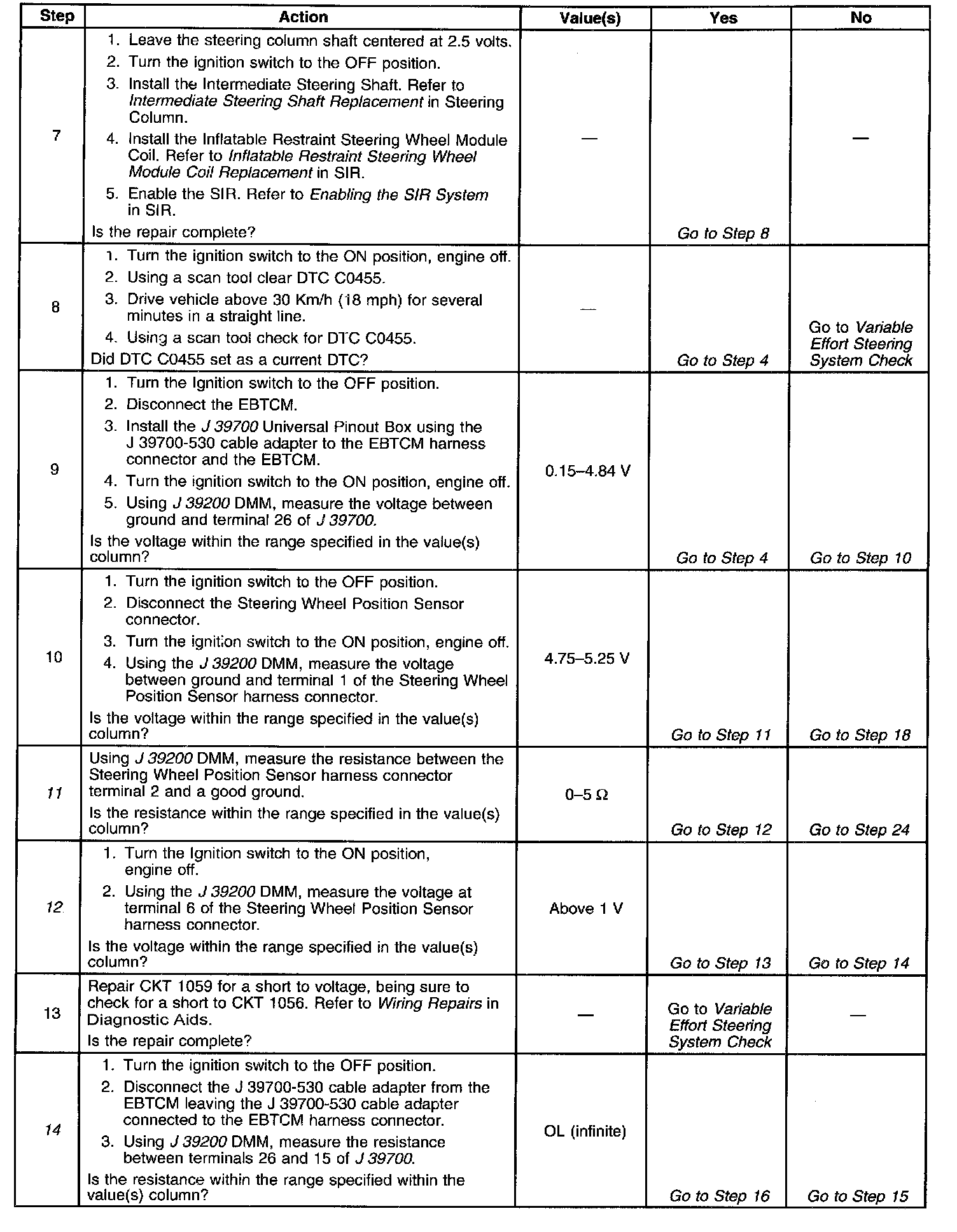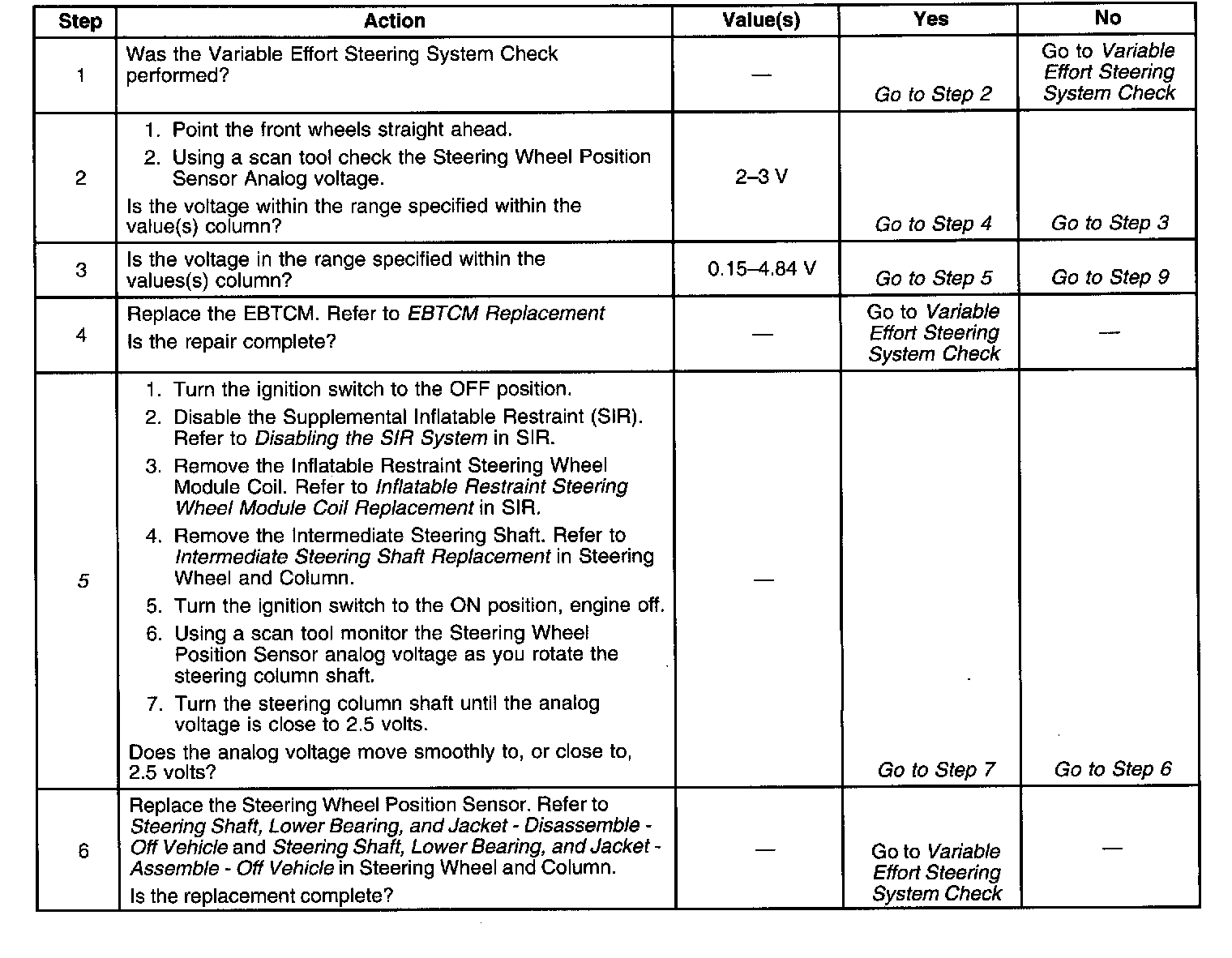 - The Steering Wheel Position Sensor analog output voltage falls outside the 0.15-4.84V range.