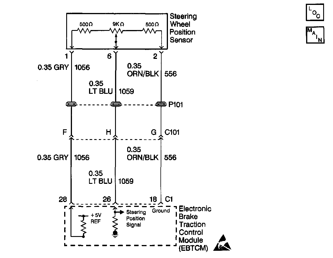 The Steering Wheel Position Sensor provides the EBTCM with an analog voltage reading from 0.15-4.84V depending on the steering wheel angle. The EBTCM uses the analog voltage for the centering routine. The EBTCM runs a centering routine when the vehicle speed goes above 30 Km/h (18 mph). When the vehicle reaches 30 Km/h (18 mph), the EBTCM monitors the Steering Wheel Position Sensor inputs (Analog voltage) to see if the steering wheel is moving. If the steering wheel is not moving for a set period of time then the EBTCM assumes the vehicle is going in a straight line. At this point, the EBTCM looks at the analog voltage signal and reads the voltage. This voltage, normally around 2.5V, is then considered the center position and the digital degrees also become zero at the same time. This centering routine is necessary to compensate for wear in the steering and suspension. Wear in the steering and suspension can result in a change in the relationship between the steering wheel and the front wheels. By running the centering routine, the EBTCM can compensate for these changes by changing the digital and analog center position.