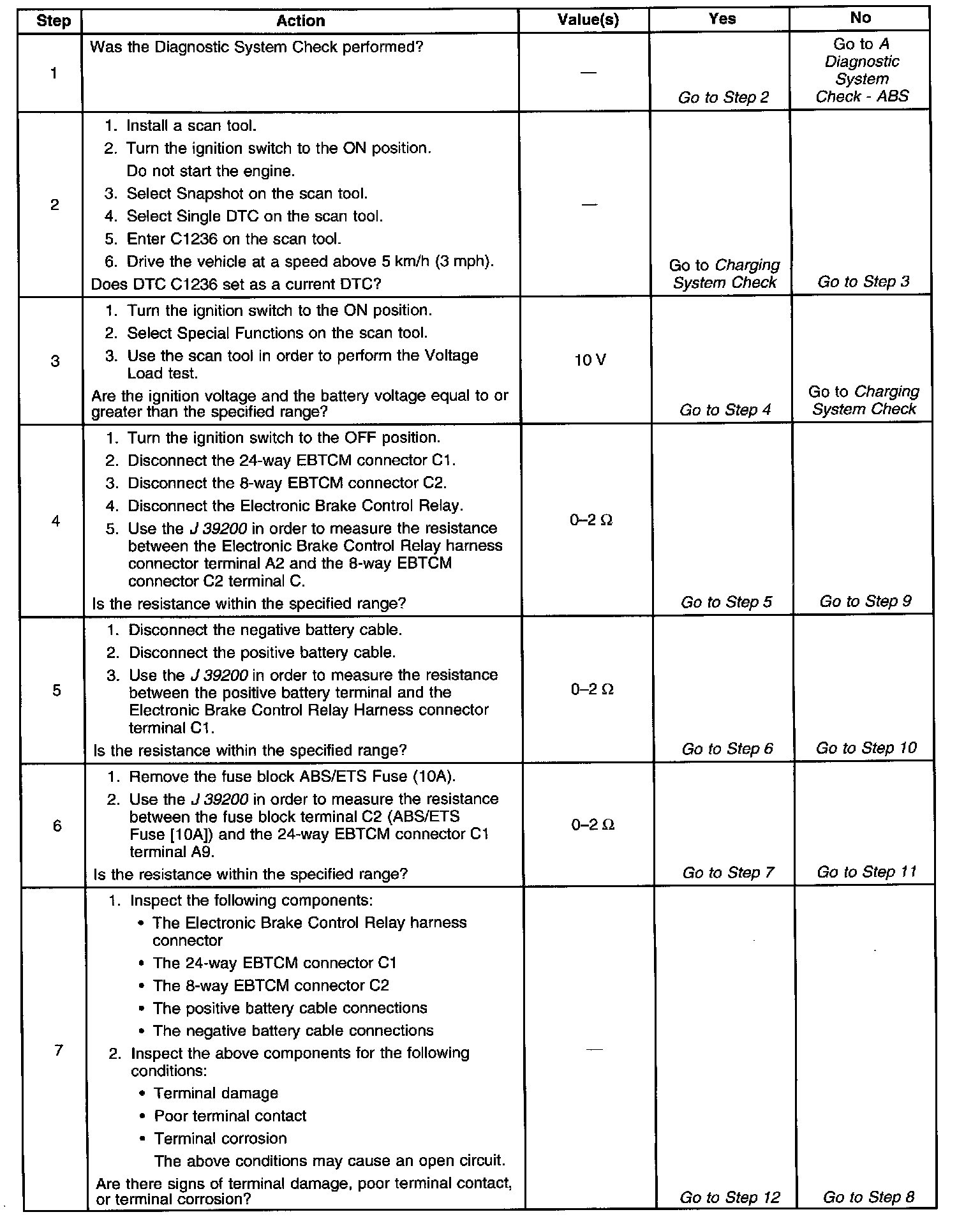 DTC C1236 monitors the voltage level available to the EBTCM controller. If the voltage drops below 11.4 volts, full performance of the ABS system is not guaranteed. During ABS operation, there are several current requirements that will cause battery voltage at the EBTCM to drop. As a result, voltage is monitored prior to an ABS event to indicate good charging system condition. Voltage is also monitored during an ABS event when voltage may drop significantly.