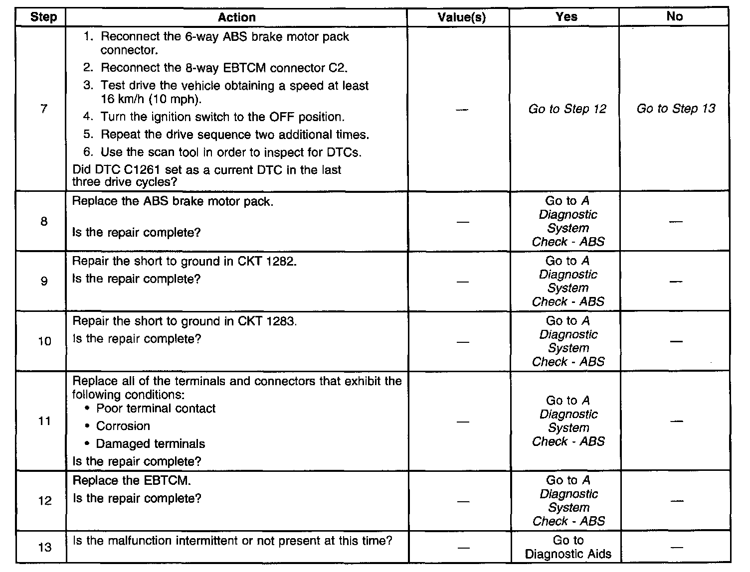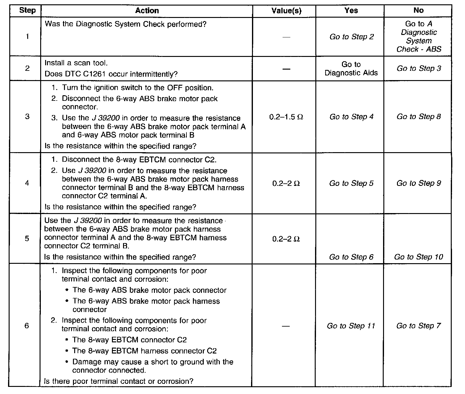 DTC 1261 identifies an ABS motor that cannot energize due to an open in the ABS motor circuitry. The malfunction will not allow proper front ABS operation.