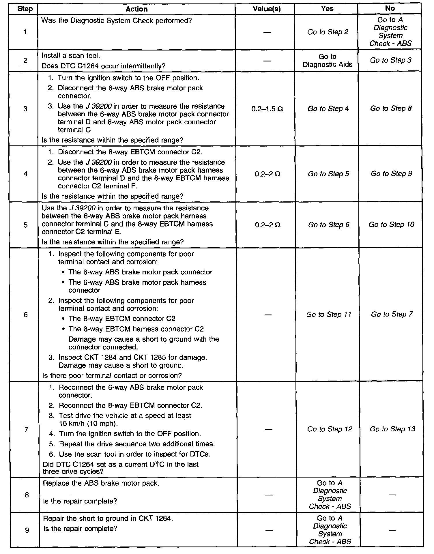 DTC 1264 identifies an ABS motor that cannot energize due to an open in the ABS motor circuitry. The malfunction will not allow proper rear ABS operation.