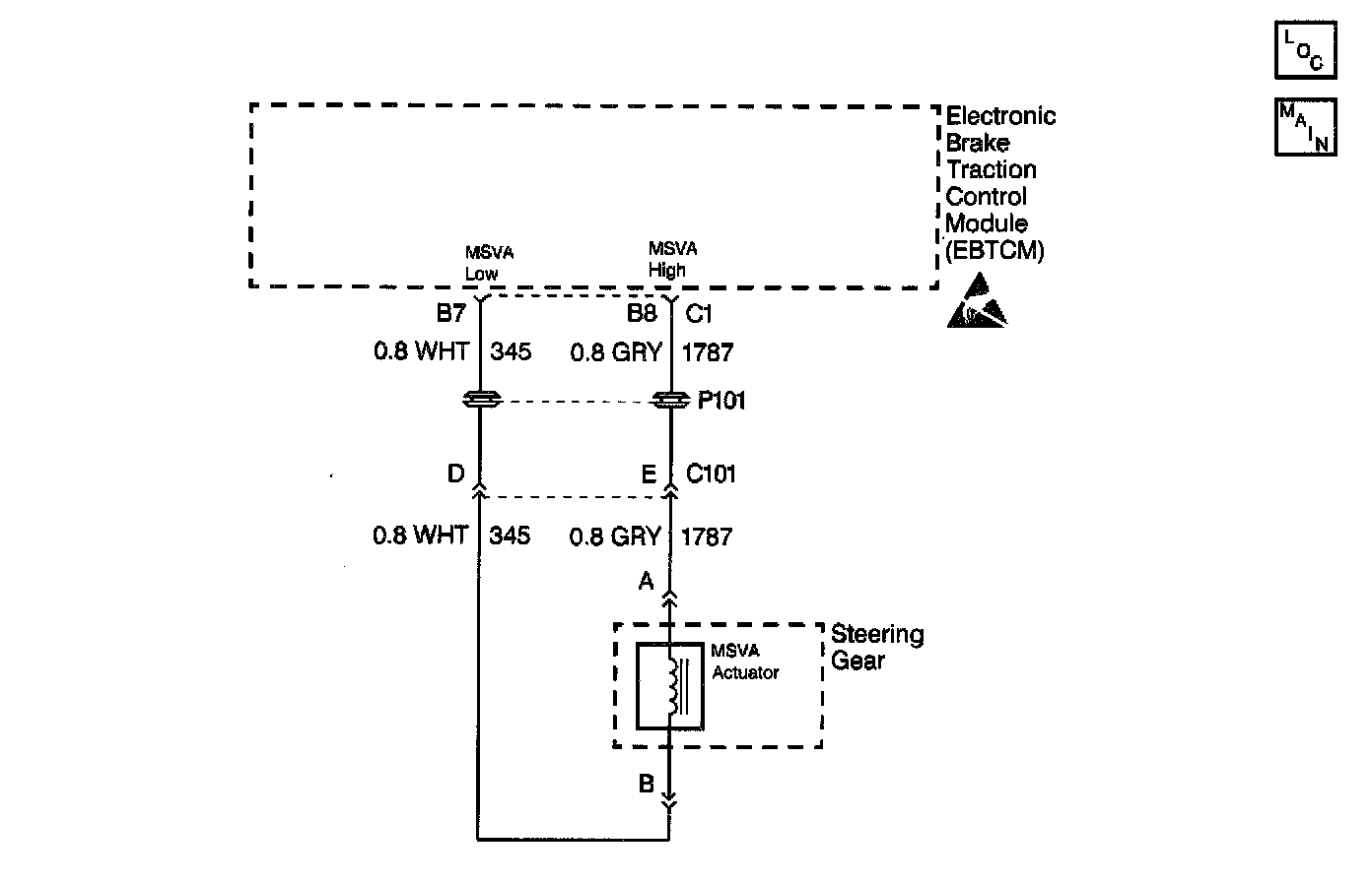 When the Electronic Brake Traction Control Module (EBTCM) commands the electronic brake control relay ON, B+ is supplied through the EBTCM connector C1 terminal Be to the MAGNASTEER actuator connector terminal A. Ground/control for the MAGNASTEER actuator is provided through the EBTCM connector C1 terminal B7 to MAGNASTEER actuator connector terminal B. The EBTCM controls the amount of current supplied to the MAGNASTEER actuator based on the input from the wheel speed sensors.