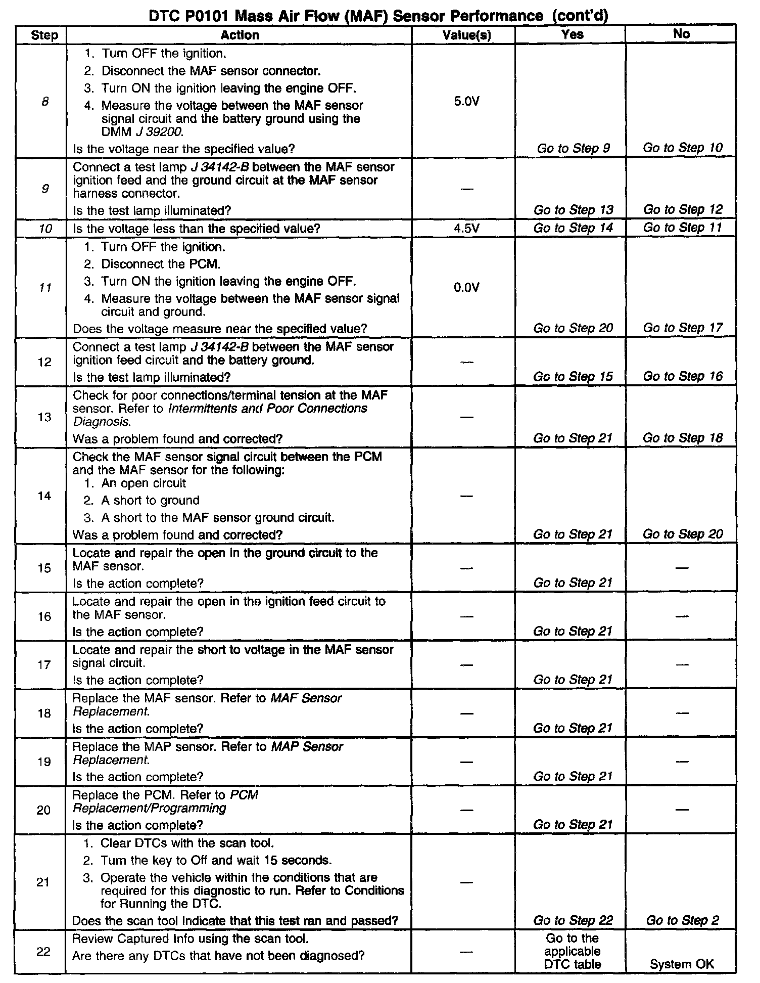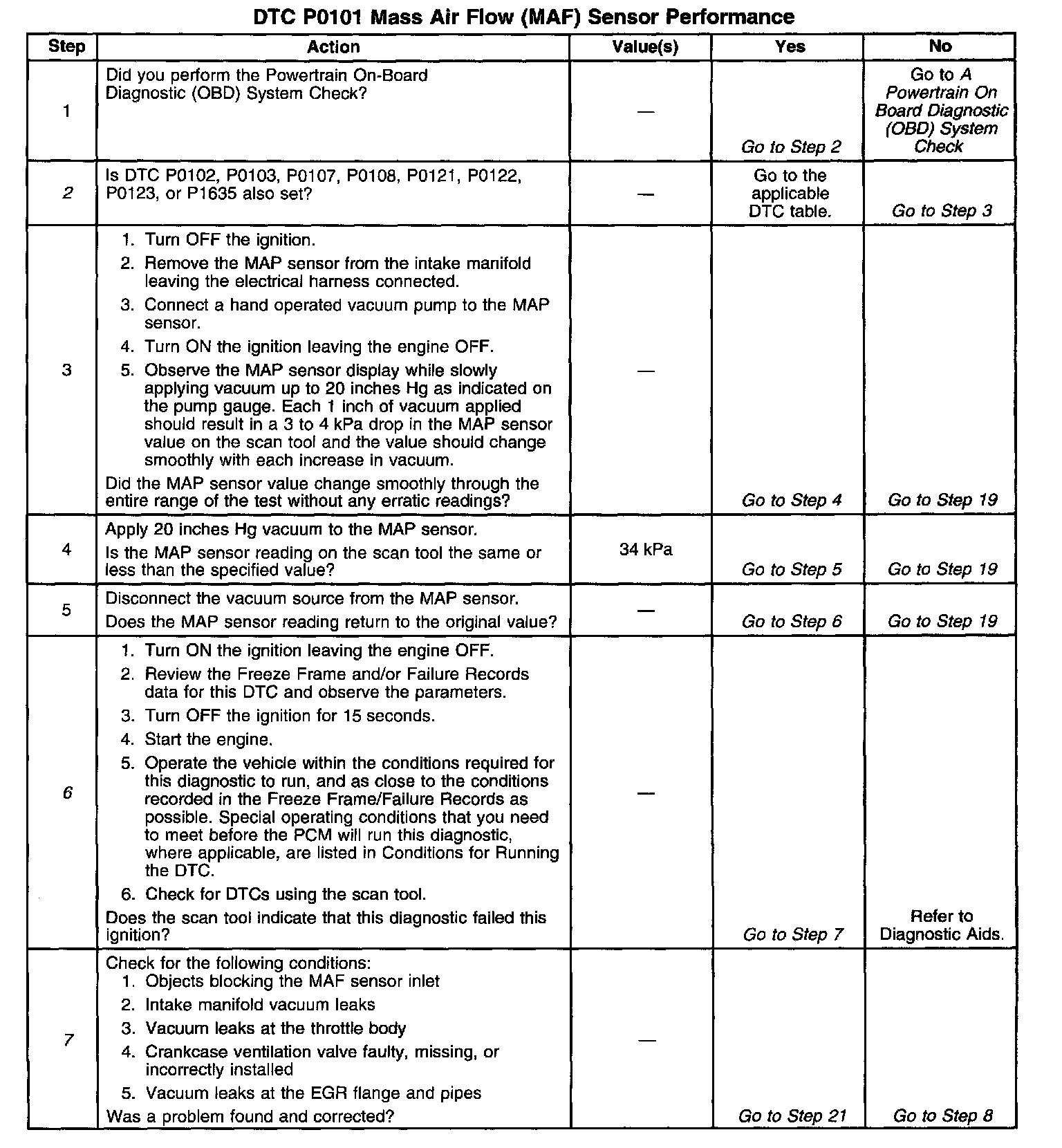 ^ Skewed or unresponsive MAP sensor. The barometric pressure used to calculate the default Mass Air Flow value is based on the MAP sensor reading. A skewed MAP sensor at key ON will cause the BARO reading to be incorrectly calculated. Also, with the engine running, an unresponsive MAP sensor (due to poor vacuum connections, damaged vacuum source, or defective vacuum hose(s), unmetered air into the manifold) will cause inaccurate BARO reading updates during wide-open Throttle conditions. Both of these conditions result in a difference between the actual MAF sensor signal and the predicted MAF value (PCM calculated). If a large difference between these two values occurs DTC P0101 will set. This condition may also cause abnormal IAC counts. With the AC at an incorrect count value, a hard start I no start condition may occur.