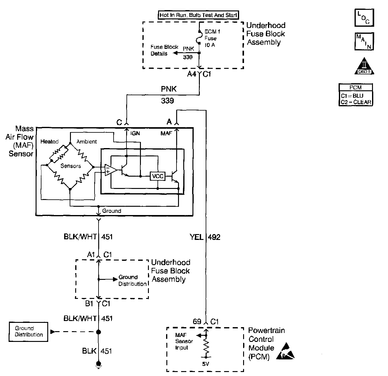 The Mass Air Flow (MAF) sensor measures the amount of air that is ingested by the engine. Direct measurement Of air entering the engine is more accurate than calculating airflow from Other sensor inputs. The MAF sensor has a ignition feed, a ground, and a signal circuit.