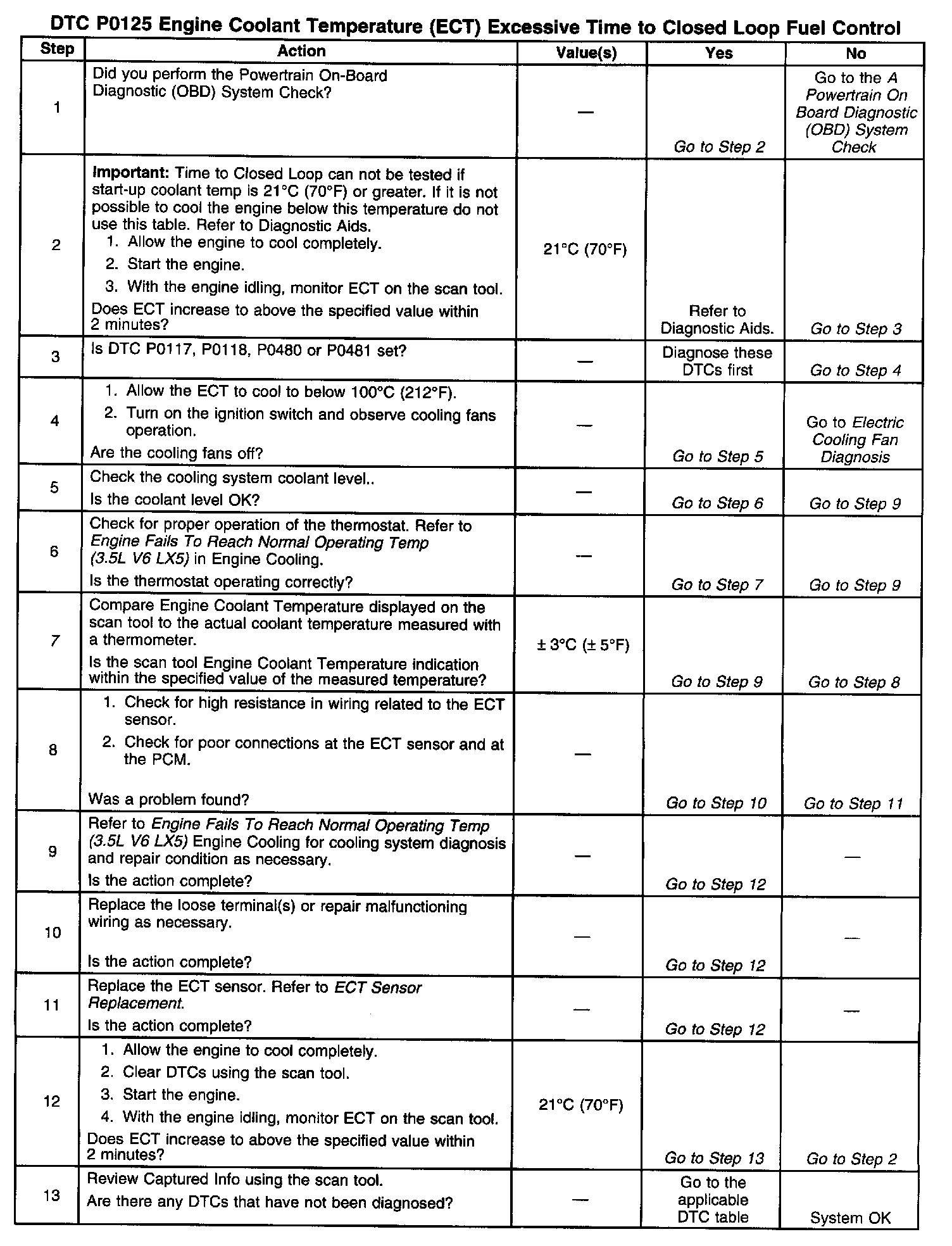 ^ DTC P0125 set may indicate a skewed ECT sensor. Comparing the engine coolant temperature displayed on a scan tool with actual coolant temperature measured with a thermometer may isolate this condition. If the displayed engine coolant temperature is not close to the actual coolant temperature, and the ECT circuit/connections check out OK, replace the ECT sensor.
