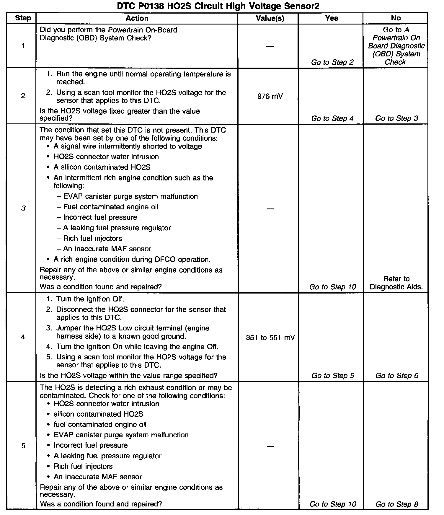 ^ Shorted Heated Oxygen Sensor (HO2S): If the HO2S is internally shorted the HO2S voltage displayed on the scan tool will be over 1 volt. Try disconnecting the affected HO2S and jumper the HO2S low circuit to ground with the key ON, engine not running. If the displayed HO2S voltage changes from over 1000 mV to around 450 mV, replace the HO2S. Silicon contamination of the HO2S can also cause a high HO2S voltage to be indicated. This condition is indicated by a powdery white deposit on the portion of the HO2S exposed to the exhaust stream. If contamination is evident, replace the affected HO2S.