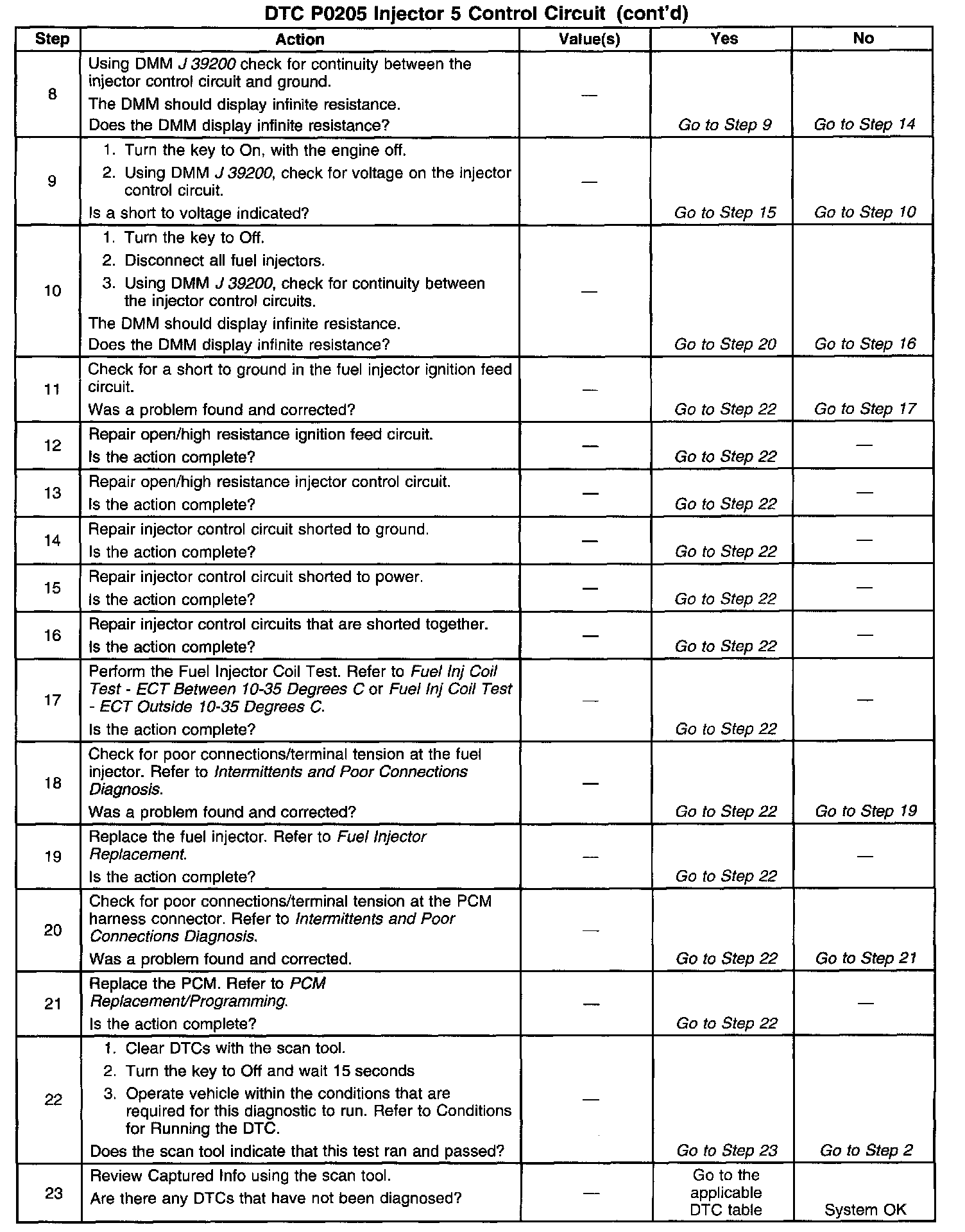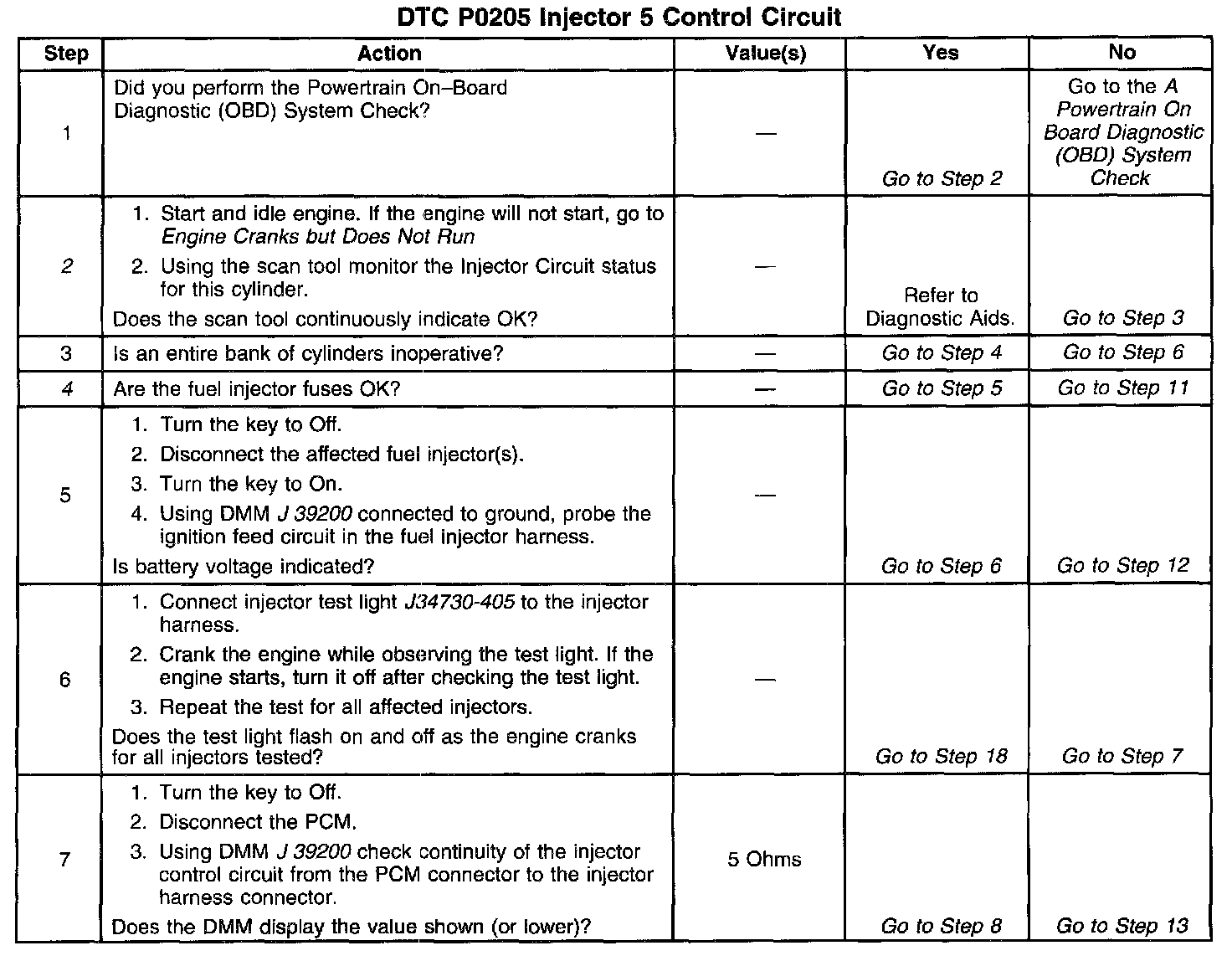 Ignition Voltage is supplied directly to the fuel injectors. The PCM controls each fuel injector by grounding the control circuit via an internal solid state device called a driver. The primary function of the driver is to supply the ground for the component being controlled. Each driver has a fault line which is monitored by the PCM. When the PCM is commanding a component on, the voltage of the control circuit should be low (near 0 volts). When the PCM is commanding the control circuit to a component off, the voltage potential of the circuit should be high (near battery voltage). If the fault detection circuit senses a voltage Other than what is expected, this DTC will set. The PCM will monitor the control circuit for the following: