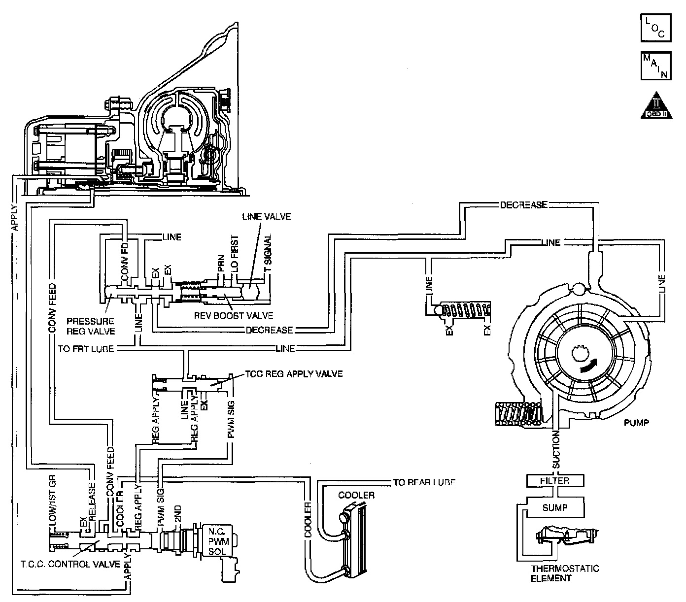 Hot fluid from the torque converter flows through the TCC control valve into the cooler lines to the oil cooler located in the vehicle radiator (and auxiliary cooler if equipped). Cool fluid then returns to lubricate the final drive assembly and Other components along the output shaft.