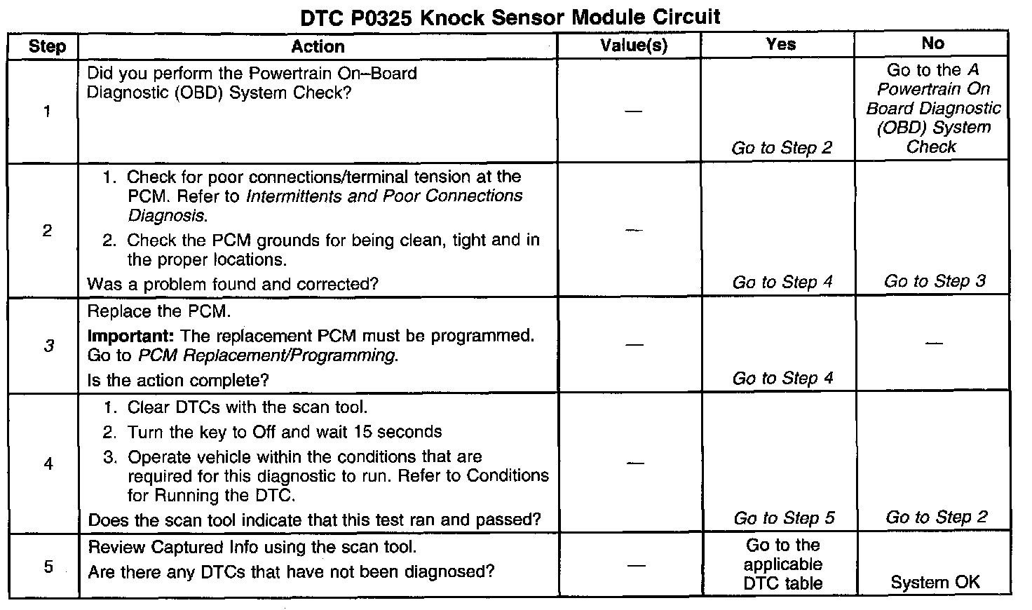 The PCM contains integrated Knock Sensor (KS) diagnostic circuitry. The input signal from the knock sensor is used to detect engine detonation, allowing the PCM to retard Ignition Control (IC) spark timing based on the amplitude and frequency of the KS signal being received. The knock sensor produces an AC signal under all engine operating conditions. During engine operation, the PCM calculates the average voltage range of the knock sensor signal. If the knock sensor system is operating normally, the PCM should monitor the KS signal voltage varying over 0.5 volt above and below the calculated average range. If the PCM malfunctions in a manner which will not allow proper diagnosis of the KS circuit, DTC P0325 will set.