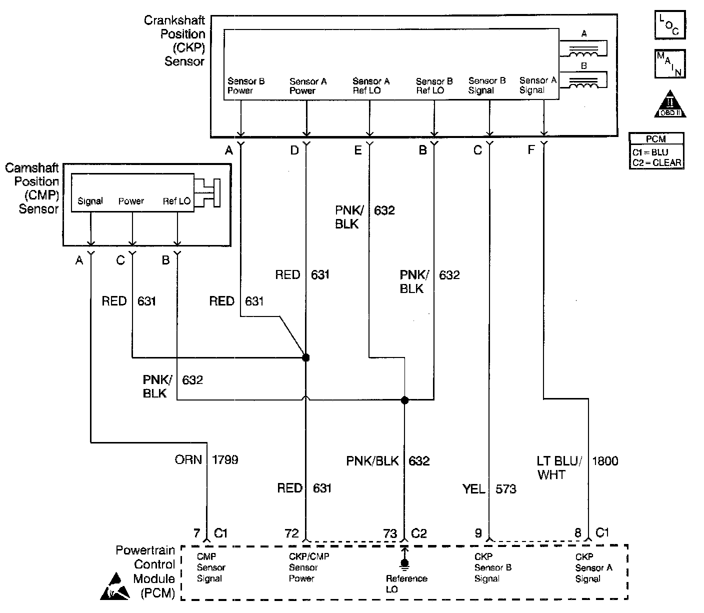 The Crankshaft Position (CKP) sensor used on this engine is actually two sensors within a single housing. Each sensor has a separate power, ground (reference low) and a signal circuit. The PCM supplies 12 Volts to both sensors. The PCM provides the ground path, or sensor return circuit, from both sensors. The power and reference low circuits are also connected to the CMP sensor. Two separate signal circuits connect the CKP sensor and the PCM. The PCM can use three different modes of decoding crankshaft position. During normal operation, the PCM performs an Angle Based calculation using both signals to determine crankshaft position. The dual sensor allows the engine to run even if one signal is lost. If either signal is lost, the PCM switches to a Time Based method of calculating crankshaft position. If the system is operating in Time A mode, the PCM is using only the signal from Sensor A. Time B indicates that the Sensor B signal is being used. If the lost signal is restored, the PCM will continue to operate in Time A or B mode for the remainder of the current key cycle. The PCM will automatically revert back to the Angle mode on the next start up if the fault is not present. The scan tool can display the Crank Position Sensing Decode Mode.