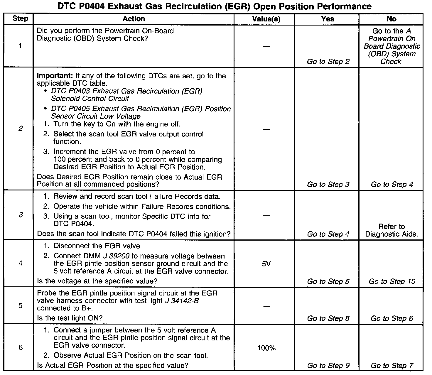 The PCM monitors the EGR valve pintle position input to ensure that the valve responds properly to commands from the PCM. The PCM compares Actual EGR Position with Desired EGR Position when the valve is commanded open. If Actual EGR Position is 15% less than Desired EGR position when the PCM is commanding the EGR valve opened, DTC P404 will set.