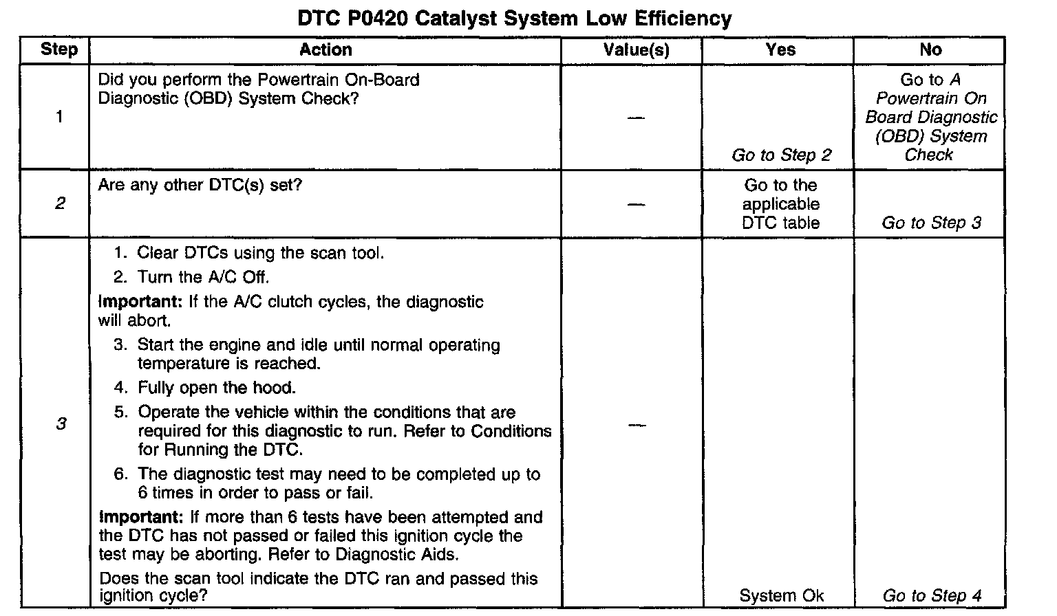 3. Clearing the DTC's allows the catalyst test to be completed up to 6 times this ignition cycle. The diagnostic will abort if the A/C clutch cycles. Turn the A/C off. The engine must be warmed-up. The converter needs to be warmed-up by raising the engine speed above idle for the specified time prior to each attempted test. Check and see if DTC passed or failed this ignition cycle. If the DTC does not pass or fail look for a possible reason that would cause the test to abort.