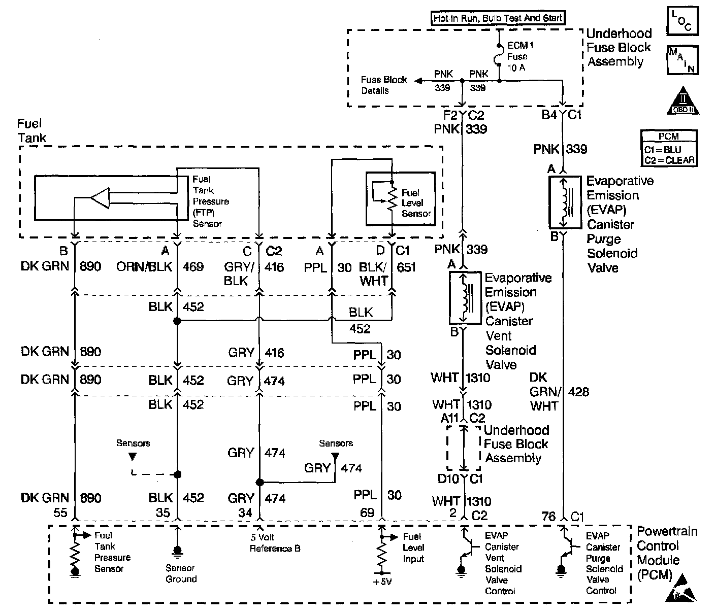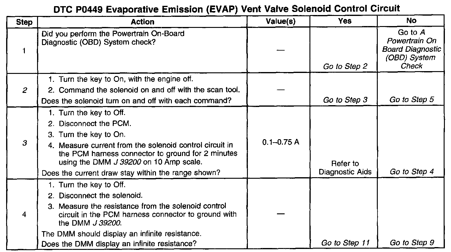 Ignition Voltage is supplied directly to the EVAP Vent solenoid valve. The PCM controls the solenoid by grounding the control circuit via an internal solid state device called a driver. The primary function of the driver is to supply the ground for the component being controlled. Each driver has a fault line which is monitored by the PCM. When the PCM is commanding a component on, the voltage of the control circuit should be low (near 0 volts). When the PCM is commanding the control circuit to a component off, the voltage potential of the circuit should be high (near battery voltage). If the fault detection circuit senses a voltage Other than what is expected, this DTC will set.