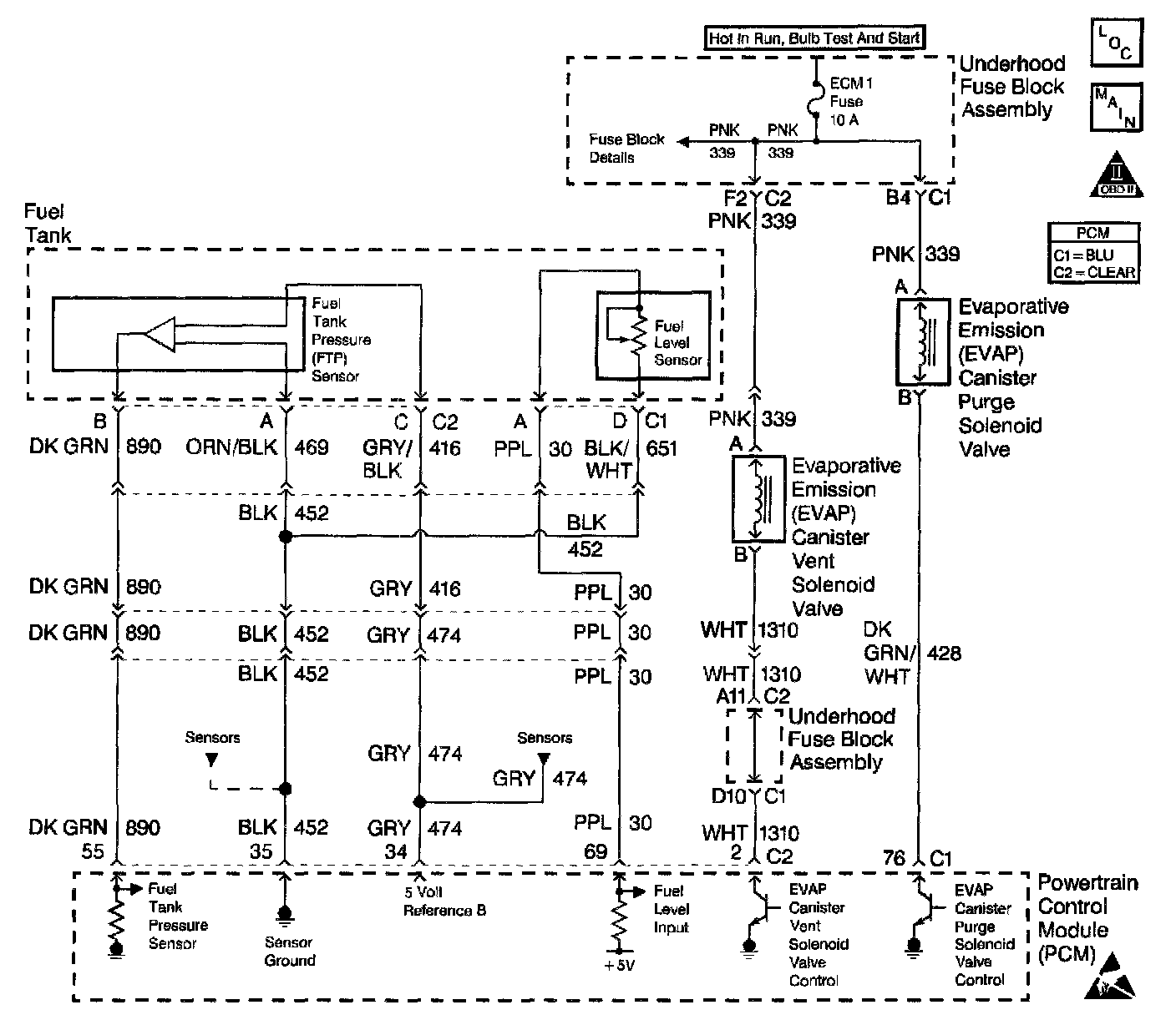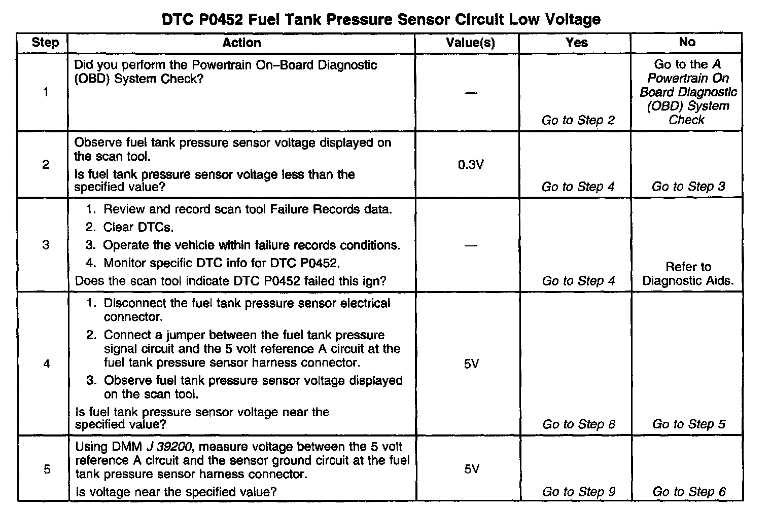 The PCM monitors the fuel tank pressure sensor signal to detect vacuum decay and excess vacuum during the enhanced EVAP diagnostic. The fuel tank pressure sensor measures the difference between the air pressure (or vacuum) in the tank and the outside air pressure. The PCM applies a 5.0 volt reference and ground to the sensor. The sensor will return a signal voltage between 0.1 and 4.9 volts. If the PCM detects a fuel tank pressure sensor signal that is excessively low, DTC P0452 will set.