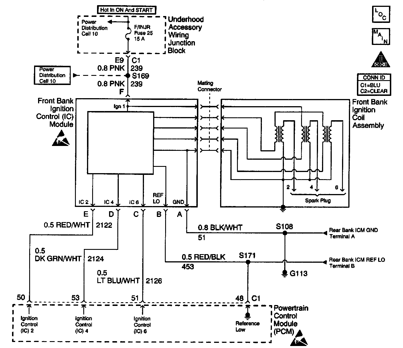 The ignition system on this engine uses an individual ignition coil for each cylinder. An ignition coil assembly consisting of three coils and an ignition control module, is located in the center of each cam cover. This arrangement allows the ignition coil to connect directly to the spark plug using only a boot. This eliminates the need for secondary ignition wires. There are separate ignition modules for Bank 1 and for Bank 2. Each module controls the three ignition coils for that bank of cylinders. The PCM controls ignition module operation. There are six Ignition Control (IC) circuits, one per cylinder, that connect the PCM and the ignition modules. The ignition modules also have a power feed, a chassis ground circuit and a Reference Low circuit each. The PCM causes spark to occur by pulsing the IC circuit, which signals the ignition module to trigger the ignition coil and fire the spark plug. Sequencing and timing are PCM controlled.