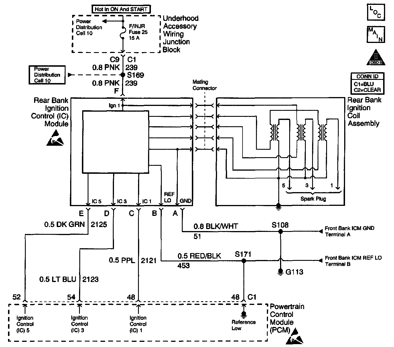 The ignition system on this engine uses an individual ignition coil for each cylinder. An ignition coil assembly consisting of three coils and an ignition control module, is located in the center of each cam cover. This arrangement allows the ignition coil to connect directly to the spark plug using only a boot. This eliminates the need for secondary ignition wires. There are separate ignition modules for Bank 1 and for Bank 2. Each module controls the three ignition coils for that bank of cylinders. The PCM controls ignition module operation. There are six Ignition Control (IC) circuits, one per cylinder, that connect the PCM and the ignition modules. The ignition modules also have a power feed, a chassis ground circuit and a Reference Low circuit each. The PCM causes spark to occur by pulsing the IC circuit, which signals the ignition module to trigger the ignition coil and fire the spark plug. Sequencing and timing are PCM controlled.