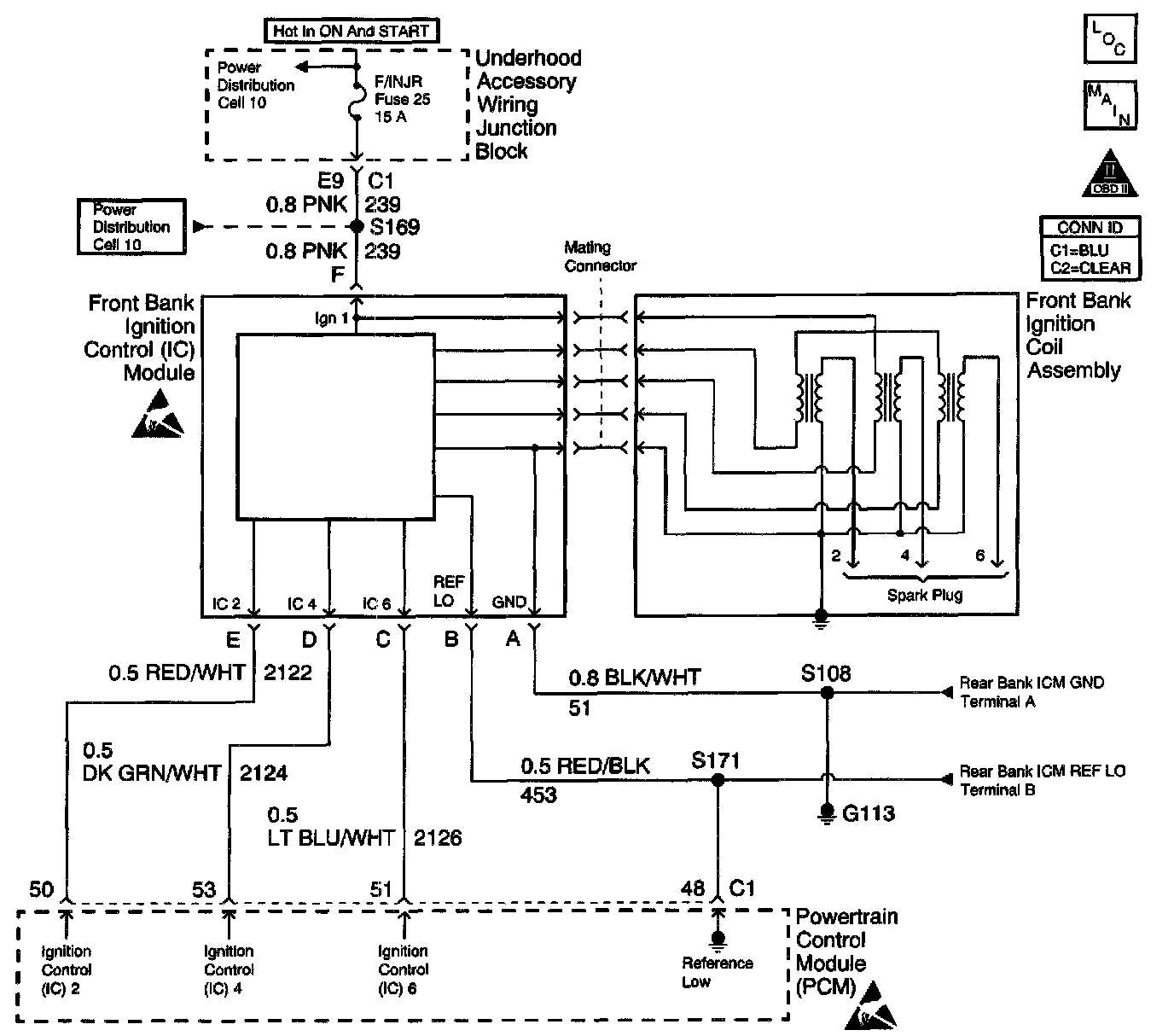The ignition system on this engine uses an individual ignition coil for each cylinder. An ignition coil assembly consisting of three coils and an ignition control module, is located in the center of each cam cover. This arrangement allows the ignition coil to connect directly to the spark plug using only a boot. This eliminates the need for secondary ignition wires. There are separate ignition modules for Bank 1 and for Bank 2. Each module controls the three ignition coils for that bank of cylinders. The PCM controls ignition module operation. There are six Ignition Control (IC) circuits, one per cylinder, that connect the PCM and the ignition modules. The ignition modules also have a power feed, a chassis ground circuit and a Reference Low circuit each. The PCM causes spark to occur by pulsing the IC circuit, which signals the ignition module to trigger the ignition coil and fire the spark plug. Sequencing and timing are PCM controlled.
