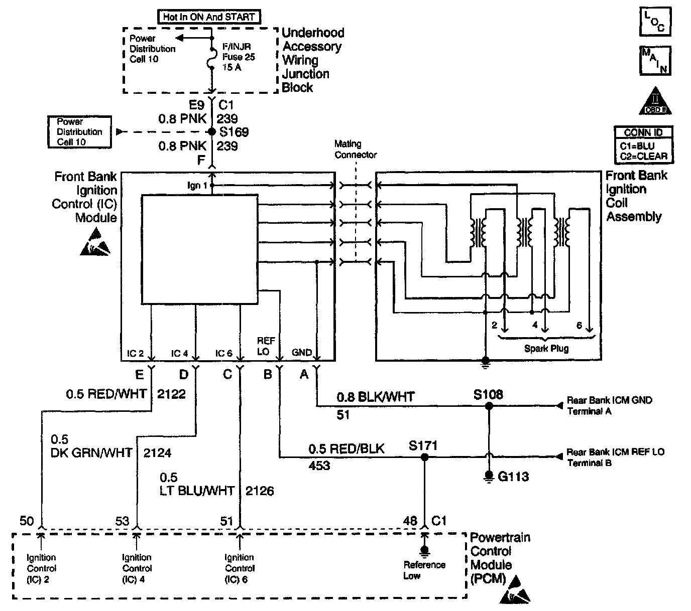 The ignition system on this engine uses an individual ignition coil for each cylinder. An ignition coil assembly consisting of three coils and an ignition control module, is located in the center of each cam cover. This arrangement allows the ignition coil to connect directly to the spark plug using only a boot. This eliminates the need for secondary ignition wires. There are separate ignition modules for Bank 1 and for Bank 2. Each module controls the three ignition coils for that bank of cylinders. The PCM controls ignition module operation. There are six Ignition Control (IC) circuits, one per cylinder, that connect the PCM and the ignition modules. The ignition modules also have a power feed, a chassis ground circuit and a Reference Low circuit each. The PCM causes spark to occur by pulsing the IC circuit, which signals the ignition module to trigger the ignition coil and fire the spark plug. Sequencing and timing are PCM controlled.