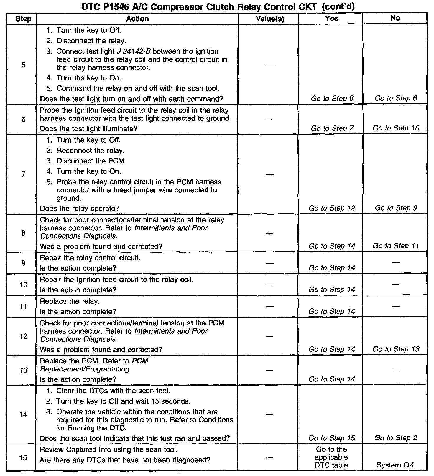 Ignition Voltage is supplied directly to the A/C Compressor Clutch relay. The PCM controls the relay by grounding the control circuit via an internal solid state device called a driver. The primary function of the driver is to supply the ground for the component being controlled. Each driver has a fault line which is monitored by the PCM. When the PCM is commanding a component on, the voltage of the control circuit should be low (near 0 volts). When the PCM is commanding the control circuit to a component off, the voltage potential of the circuit should be high (near battery voltage). If the fault detection circuit senses a voltage Other than what is expected, this DTC will set.
