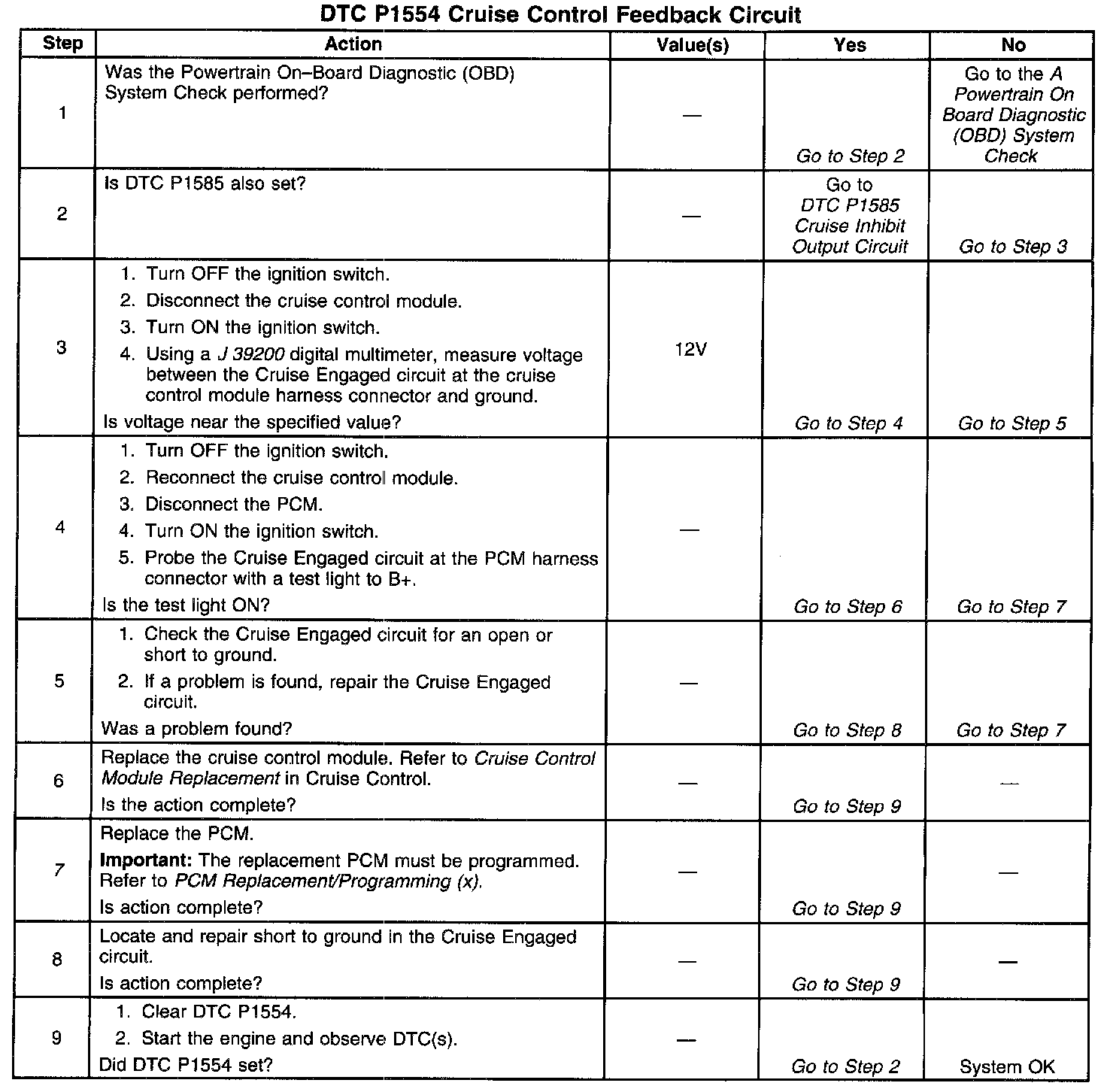 If any of these conditions are present, the PCM opens the ground on the cruise inhibit circuit to request that cruise control be disengaged. The cruise control module detects the high signal voltage and disables the system. If the cruise engaged signal indicates that cruise control is still engaged while the PCM is inhibiting cruise control operation, DTC P1554 will be set.