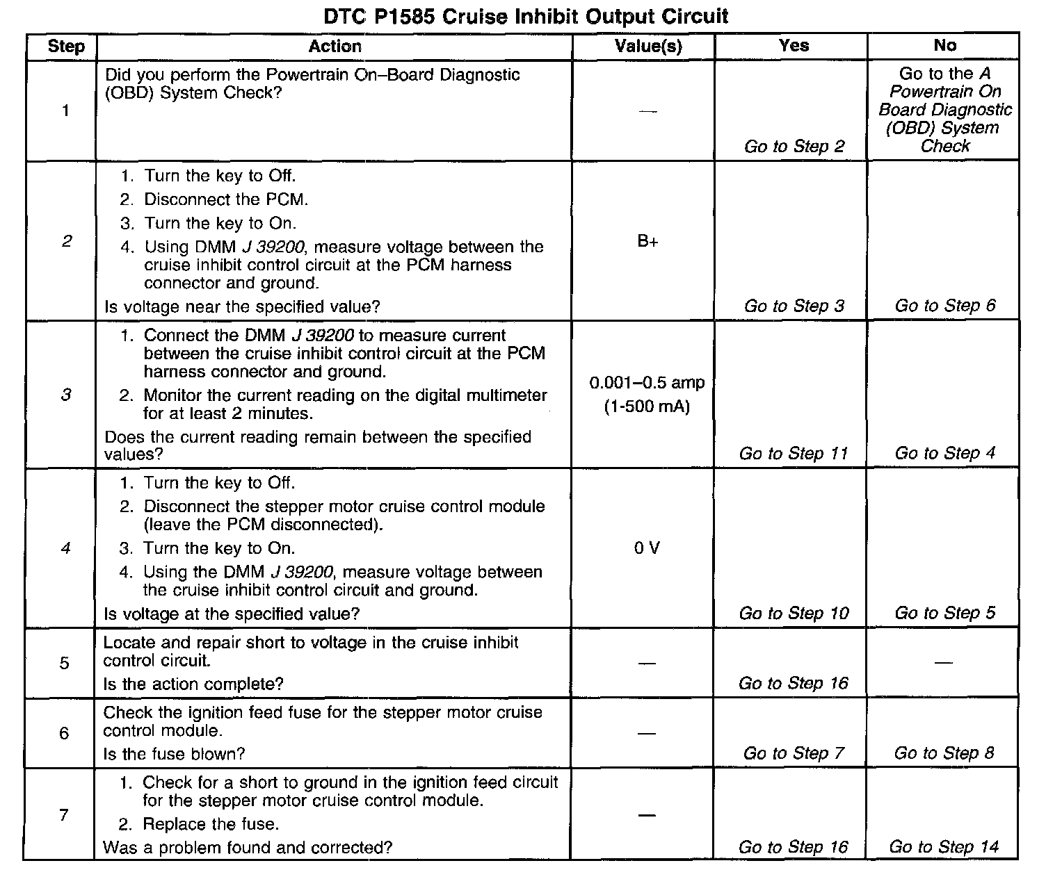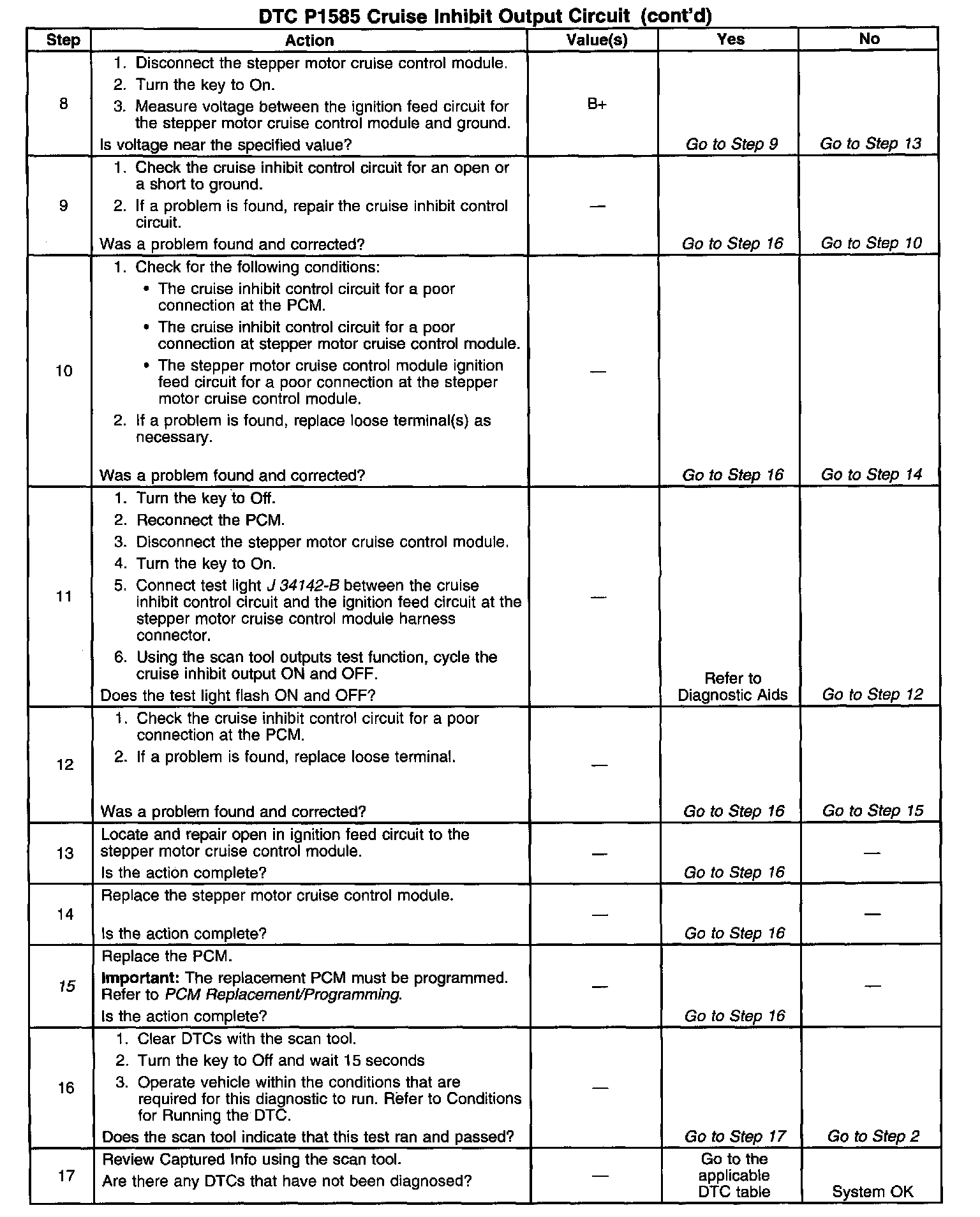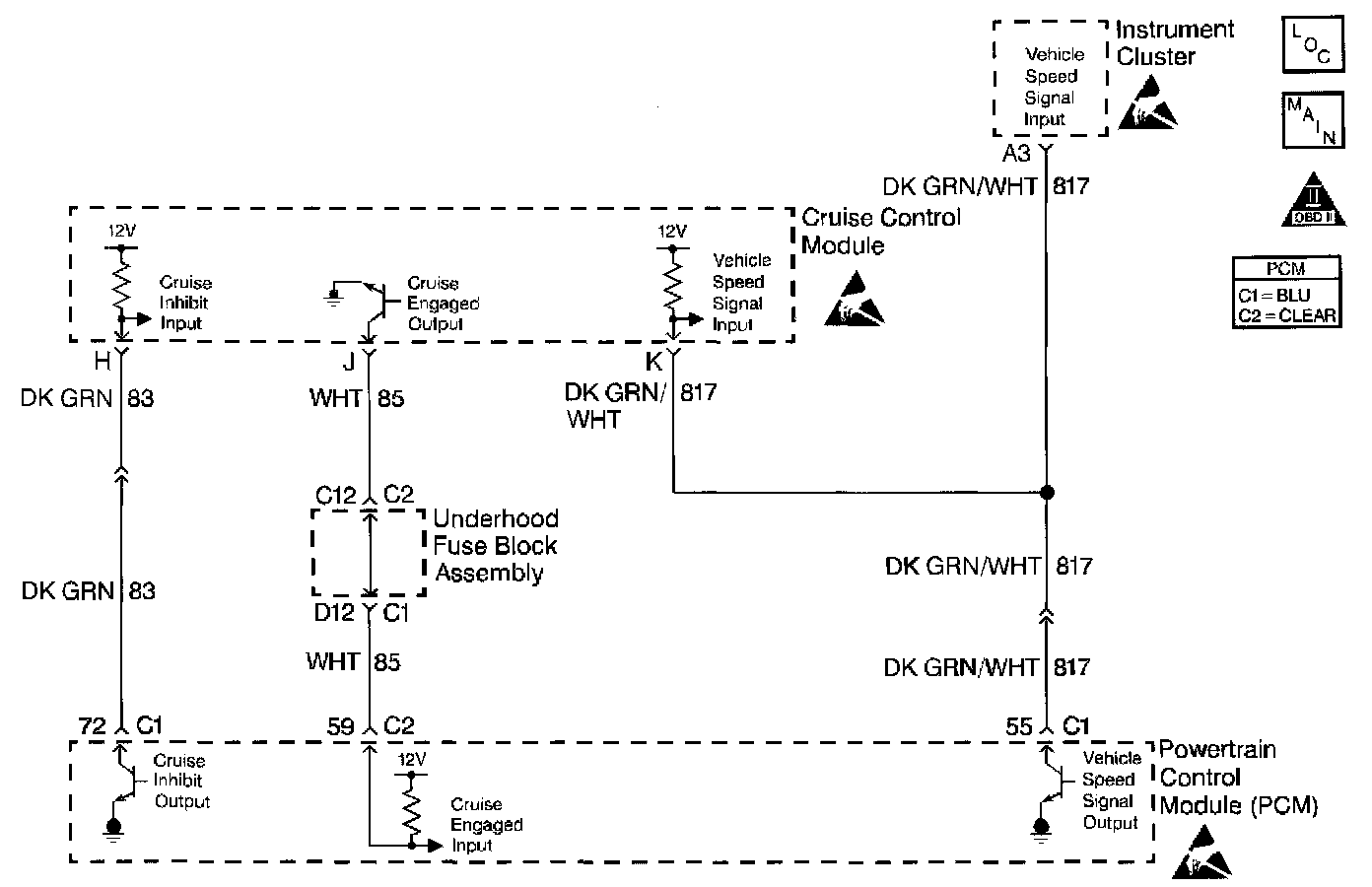 The Cruise Control module pulls the Cruise Inhibit circuit up to approximately 12 volts. When the PCM determines that cruise control is allowed, the PCM grounds the Cruise Inhibit circuit. The Cruise Control module detects the low voltage signal and enables the system. The PCM grounds the cruise inhibit circuit via an internal solid state device called a driver. The primary function of the driver is to supply the ground for the component being controlled. Each driver has a fault line which is monitored by the PCM. If the fault detection circuit senses a voltage Other than what is expected, this DTC will set.