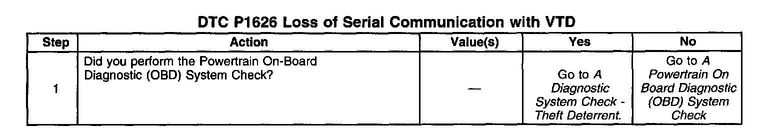 This diagnostic test checks for the loss of or invalid Theft Deterrent System serial data to the PCM. When such a condition exists for 11 seconds DTC P1626 is set.