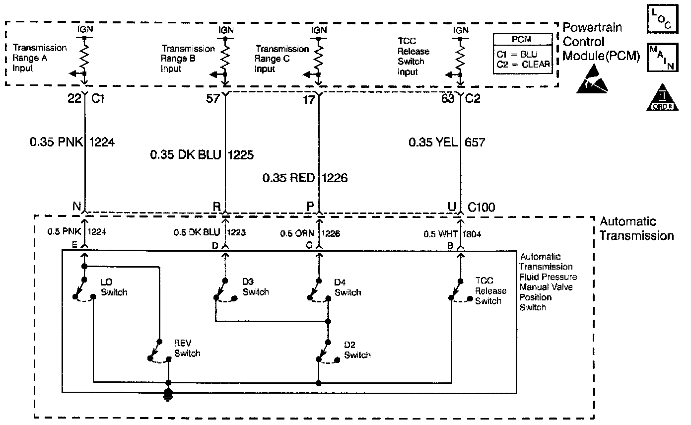 The automatic transmission fluid pressure (TFP) manual valve position switch consists of six pressure switches (three normally-closed and three normally-open switches). Ignition voltage is applied to each of the switches. By grounding or opening one or more of these switches with fluid pressure from the manual valve, the PCM can detect which gear range is selected.